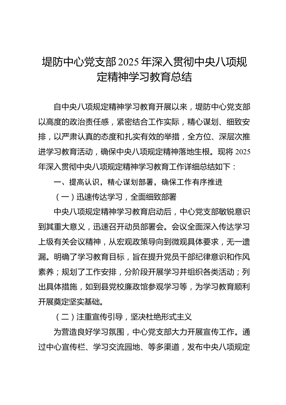 堤防中心黨支部2025年深入貫徹中央八項規(guī)定精神學(xué)習(xí)教育總結(jié)