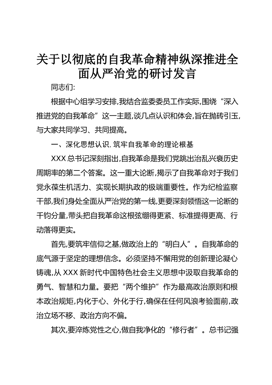 關(guān)于以徹底的自我革命精神縱深推進(jìn)全面從嚴(yán)治黨的研討發(fā)言同志們:根據(jù)中心組學(xué)習(xí)安排,我結(jié)合監(jiān)委委員工作實(shí)際,圍繞“深入推進(jìn)黨的自我革命”這一主題,談幾點(diǎn)認(rèn)識(shí)和體會(huì),旨在拋磚引玉,與大家共同學(xué)習(xí)、共同提高。一、深化思想認(rèn)識(shí),筑牢自我革命的理論根基XXX總書記深刻指出,自我革命是我們黨跳出治亂興衰歷史周期率的第二個(gè)答案。這一重大論斷,揭示了自我革命對(duì)于我們黨永葆生機(jī)活力、實(shí)現(xiàn)長期執(zhí)政的極端重要性。作為紀(jì)檢監(jiān)察干部,我們身處全面從嚴(yán)治黨的第一線,更要深刻領(lǐng)悟這一論斷的千鈞分量,帶頭把自我革命這根弦繃得更緊、標(biāo)準(zhǔn)提得更高、行動(dòng)落得更實(shí)。首先,要筑牢信...