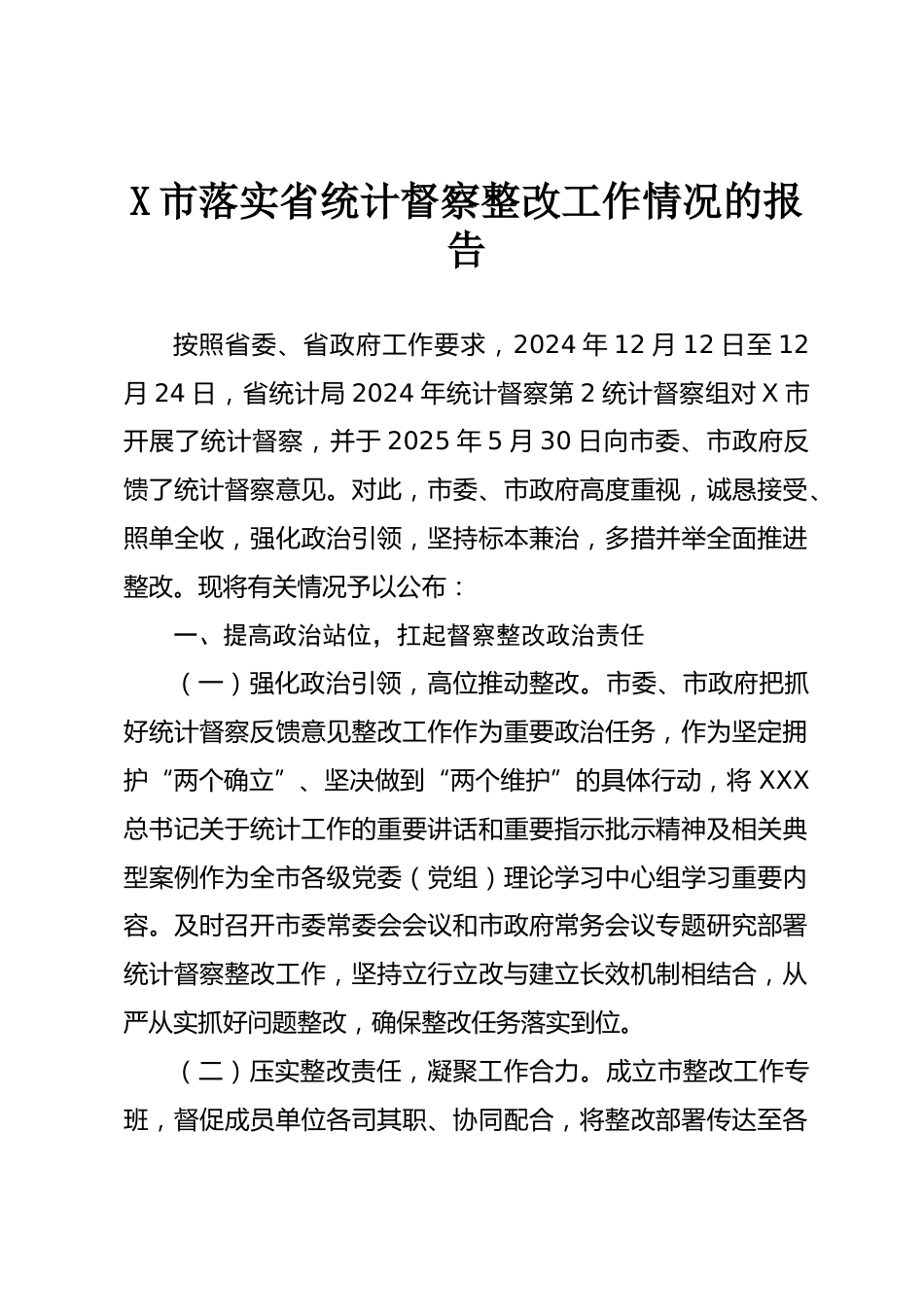 X市落實省統(tǒng)計督察整改工作情況的報告按照省委、省政府工作要求,2024年12月12日至12月24日,省統(tǒng)計局2024年統(tǒng)計督察第2統(tǒng)計督察組對X市開展了統(tǒng)計督察,并于2025年5月30日向市委、市政府反饋了統(tǒng)計督察意見。對此,市委、市政府高度重視,誠懇接受、照單全收,強化政治引領,堅持標本兼治,多措并舉全面推進整改?,F(xiàn)將有關情況予以公布:一、提高政治站位,扛起督察整改政治責任(一)強化政治引領,高位推動整改。市委、市政府把抓好統(tǒng)計督察反饋意見整改工作作為重要政治任務,作為堅定擁護“兩個確立”、堅決做到“兩個維護”的具體行動,將XXX總書記關于統(tǒng)計工作的...
