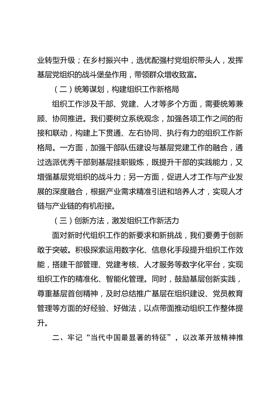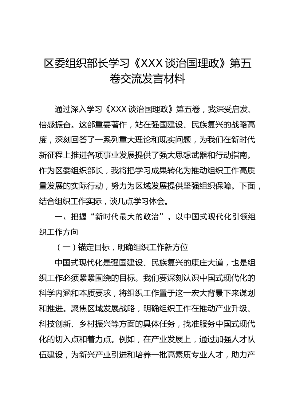 區(qū)委組織部長(zhǎng)學(xué)習(xí)《XXX談治國(guó)理政》第五卷交流發(fā)言材料通過(guò)深入學(xué)習(xí)《XXX談治國(guó)理政》第五卷,我深受啟發(fā)、倍感振奮。這部重要著作,站在強(qiáng)國(guó)建設(shè)、民族復(fù)興的戰(zhàn)略高度,深刻回答了一系列重大理論和現(xiàn)實(shí)問(wèn)題,為我們?cè)谛聲r(shí)代新征程上推進(jìn)各項(xiàng)事業(yè)發(fā)展提供了強(qiáng)大思想武器和行動(dòng)指南。作為區(qū)委組織部長(zhǎng),我將把學(xué)習(xí)成果轉(zhuǎn)化為推動(dòng)組織工作高質(zhì)量發(fā)展的實(shí)際行動(dòng),努力為區(qū)域發(fā)展提供堅(jiān)強(qiáng)組織保障。下面,結(jié)合組織工作實(shí)際,談幾點(diǎn)學(xué)習(xí)體會(huì)。一、把握“新時(shí)代最大的政治”,以中國(guó)式現(xiàn)代化引領(lǐng)組織工作方向(一)錨定目標(biāo),明確組織工作新方位中國(guó)式現(xiàn)代化是強(qiáng)國(guó)建設(shè)、民族復(fù)...