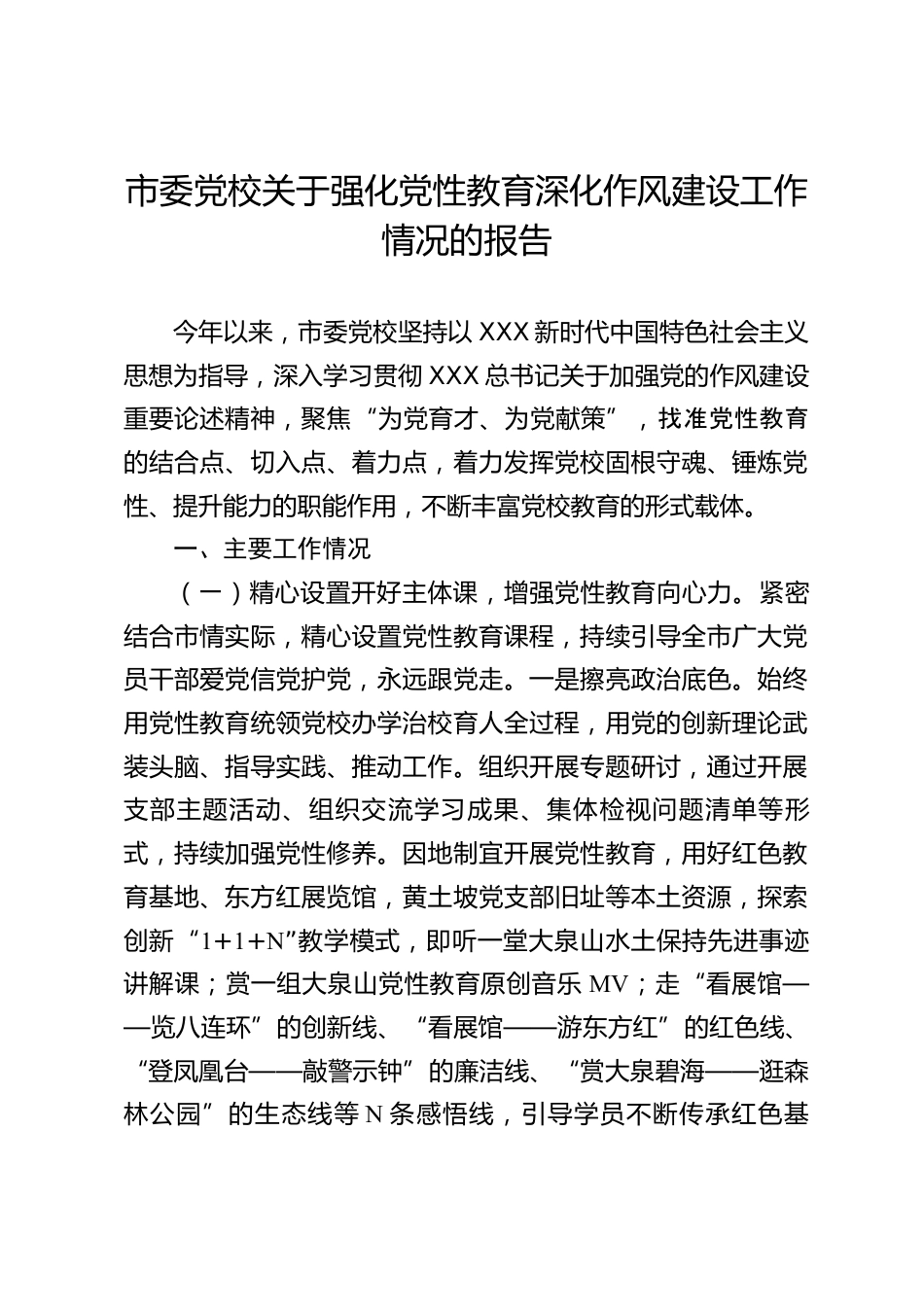 市委黨校關(guān)于強(qiáng)化黨性教育深化作風(fēng)建設(shè)工作情況的報告今年以來,市委黨校堅持以XXX新時代中國特色社會主義思想為指導(dǎo),深入學(xué)習(xí)貫徹XXX總書記關(guān)于加強(qiáng)黨的作風(fēng)建設(shè)重要論述精神,聚焦“為黨育才、為黨獻(xiàn)策”,找準(zhǔn)黨性教育的結(jié)合點(diǎn)、切入點(diǎn)、著力點(diǎn),著力發(fā)揮黨校固根守魂、錘煉黨性、提升能力的職能作用,不斷豐富黨校教育的形式載體。一、主要工作情況(一)精心設(shè)置開好主體課,增強(qiáng)黨性教育向心力。緊密結(jié)合市情實(shí)際,精心設(shè)置黨性教育課程,持續(xù)引導(dǎo)全市廣大黨員干部愛黨信黨護(hù)黨,永遠(yuǎn)跟黨走。一是擦亮政治底色。始終用黨性教育統(tǒng)領(lǐng)黨校辦學(xué)治校育人全過程,用黨的...