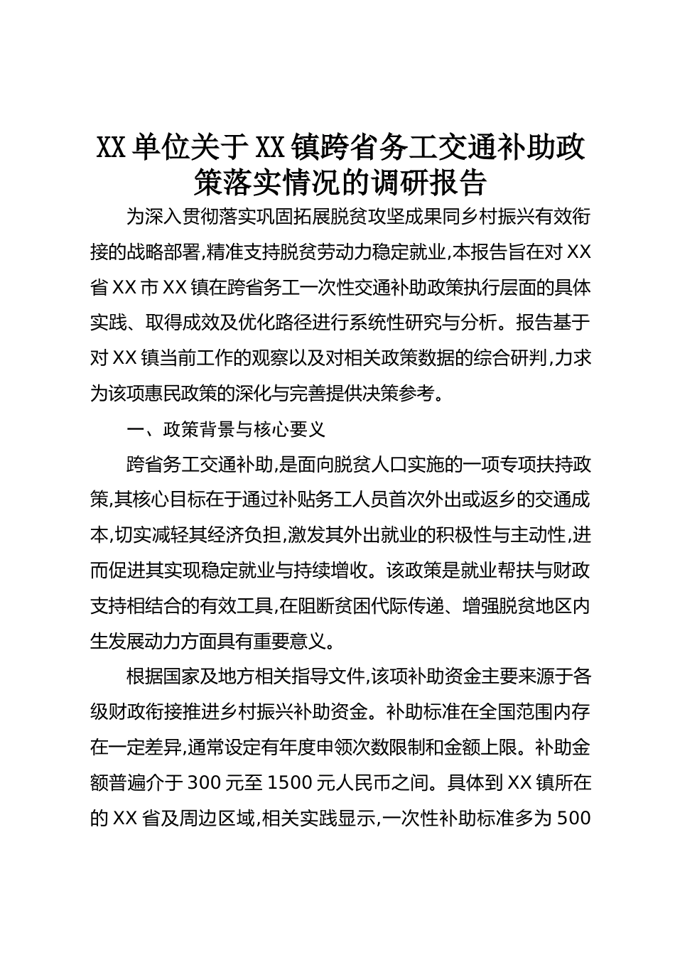 XX單位關(guān)于XX鎮(zhèn)跨省務(wù)工交通補(bǔ)助政策落實(shí)情況的調(diào)研報(bào)告為深入貫徹落實(shí)鞏固拓展脫貧攻堅(jiān)成果同鄉(xiāng)村振興有效銜接的戰(zhàn)略部署,精準(zhǔn)支持脫貧勞動(dòng)力穩(wěn)定就業(yè),本報(bào)告旨在對(duì)XX省XX市XX鎮(zhèn)在跨省務(wù)工一次性交通補(bǔ)助政策執(zhí)行層面的具體實(shí)踐、取得成效及優(yōu)化路徑進(jìn)行系統(tǒng)性研究與分析。報(bào)告基于對(duì)XX鎮(zhèn)當(dāng)前工作的觀察以及對(duì)相關(guān)政策數(shù)據(jù)的綜合研判,力求為該項(xiàng)惠民政策的深化與完善提供決策參考。一、政策背景與核心要義跨省務(wù)工交通補(bǔ)助,是面向脫貧人口實(shí)施的一項(xiàng)專項(xiàng)扶持政策,其核心目標(biāo)在于通過補(bǔ)貼務(wù)工人員首次外出或返鄉(xiāng)的交通成本,切實(shí)減輕其經(jīng)濟(jì)負(fù)擔(dān),激發(fā)其外出就業(yè)的積極性與...