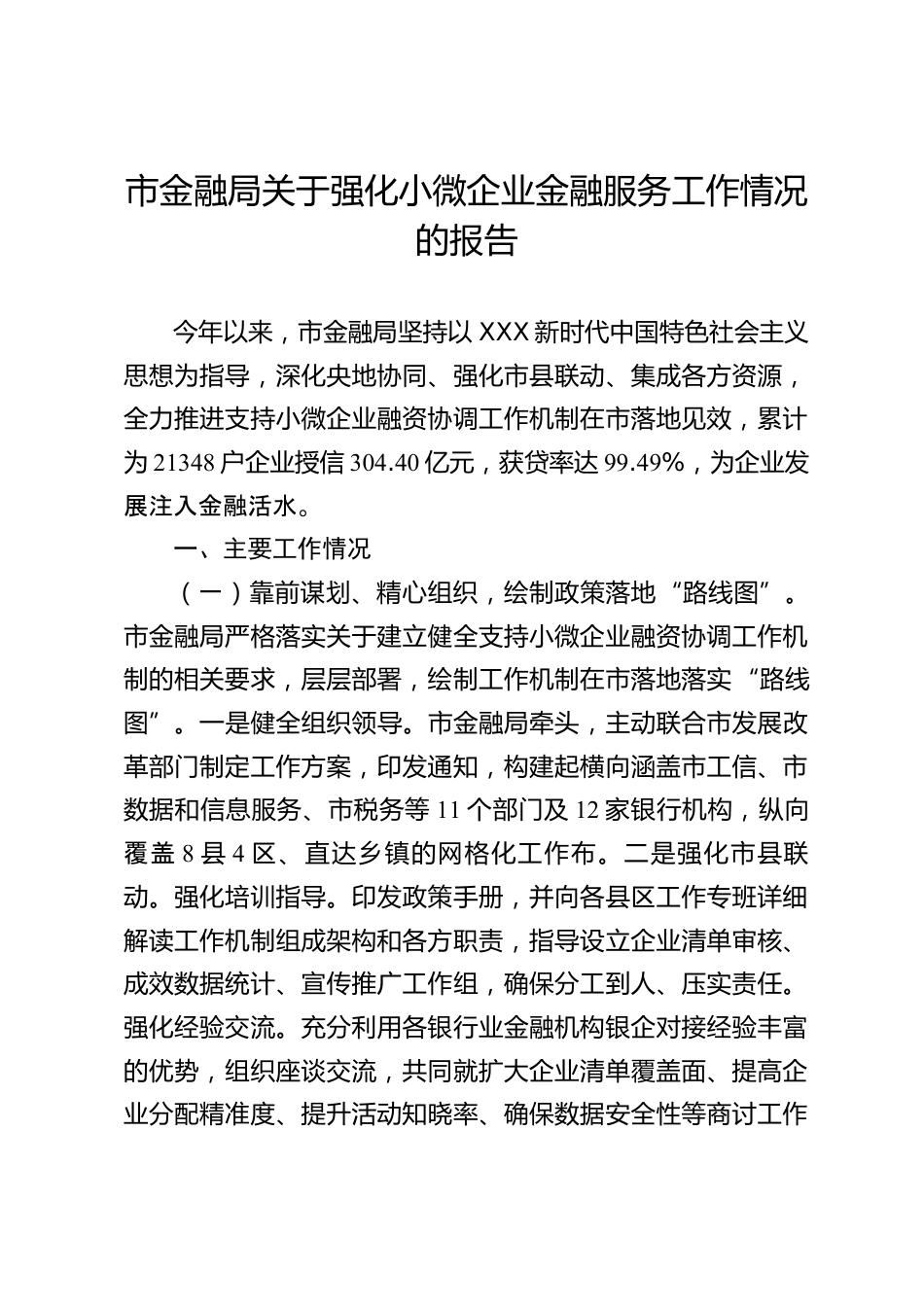 市金融局關(guān)于強(qiáng)化小微企業(yè)金融服務(wù)工作情況的報(bào)告今年以來,市金融局堅(jiān)持以XXX新時(shí)代中國(guó)特色社會(huì)主義思想為指導(dǎo),深化央地協(xié)同、強(qiáng)化市縣聯(lián)動(dòng)、集成各方資源,全力推進(jìn)支持小微企業(yè)融資協(xié)調(diào)工作機(jī)制在市落地見效,累計(jì)為21348戶企業(yè)授信304.40億元,獲貸率達(dá)99.49%,為企業(yè)發(fā)展注入金融活水。一、主要工作情況(一)靠前謀劃、精心組織,繪制政策落地“路線圖”。市金融局嚴(yán)格落實(shí)關(guān)于建立健全支持小微企業(yè)融資協(xié)調(diào)工作機(jī)制的相關(guān)要求,層層部署,繪制工作機(jī)制在市落地落實(shí)“路線圖”。一是健全組織領(lǐng)導(dǎo)。市金融局牽頭,主動(dòng)聯(lián)合市發(fā)展改革部門制定工作方案,印發(fā)通知,...