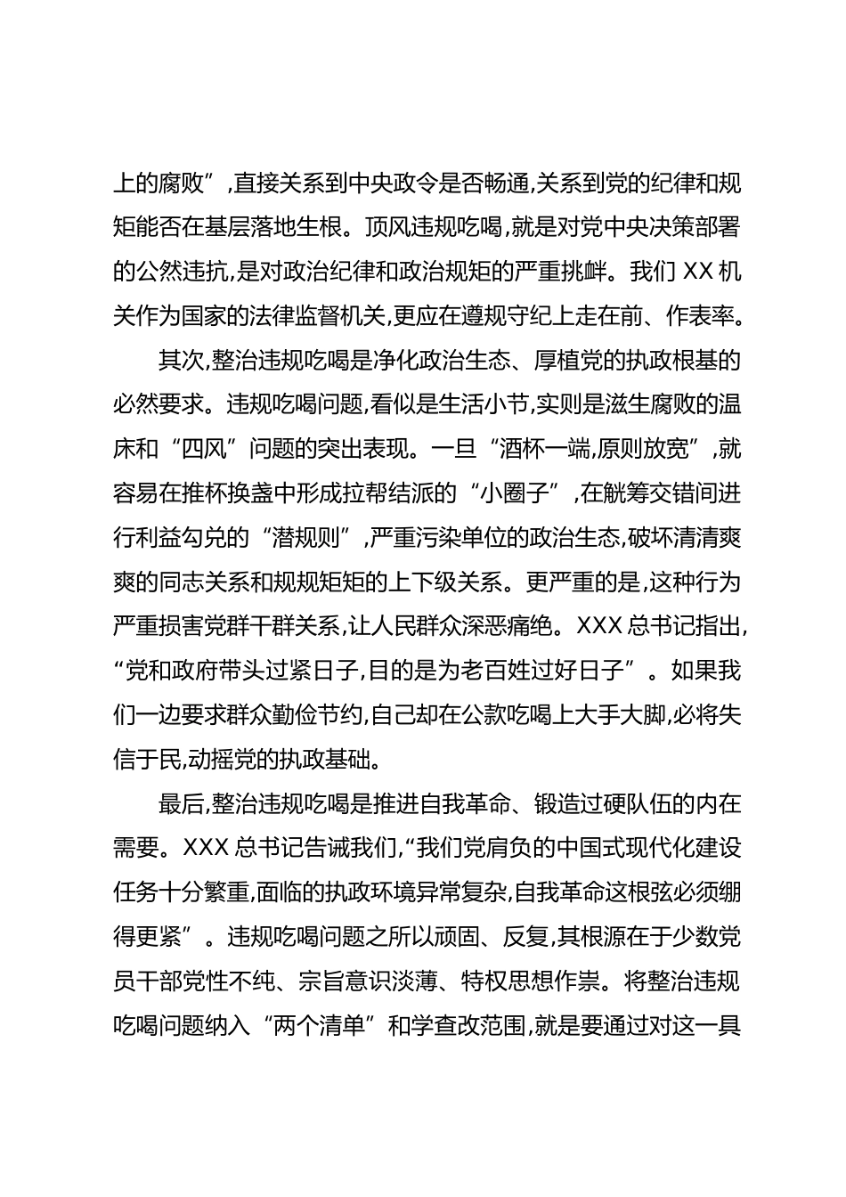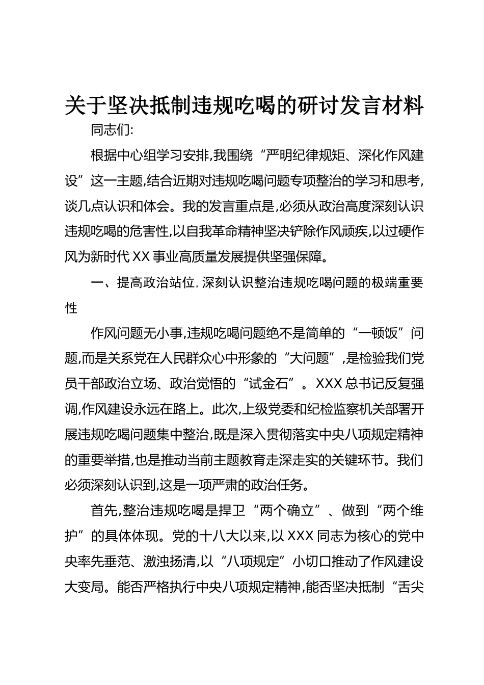 關(guān)于堅決抵制違規(guī)吃喝的研討發(fā)言材料同志們:根據(jù)中心組學(xué)習(xí)安排,我圍繞“嚴明紀律規(guī)矩、深化作風(fēng)建設(shè)”這一主題,結(jié)合近期對違規(guī)吃喝問題專項整治的學(xué)習(xí)和思考,談幾點認識和體會。我的發(fā)言重點是,必須從政治高度深刻認識違規(guī)吃喝的危害性,以自我革命精神堅決鏟除作風(fēng)頑疾,以過硬作風(fēng)為新時代XX事業(yè)高質(zhì)量發(fā)展提供堅強保障。一、提高政治站位,深刻認識整治違規(guī)吃喝問題的極端重要性作風(fēng)問題無小事,違規(guī)吃喝問題絕不是簡單的“一頓飯”問題,而是關(guān)系黨在人民群眾心中形象的“大問題”,是檢驗我們黨員干部政治立場、政治覺悟的“試金石”。XXX總書記反復(fù)強調(diào),作風(fēng)建設(shè)永遠在...