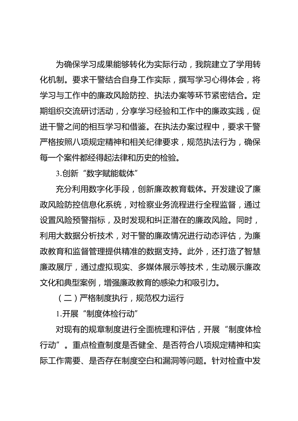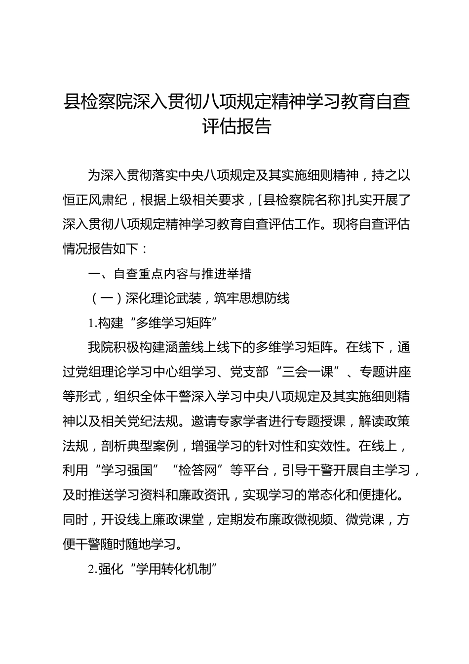 縣檢察院深入貫徹八項規(guī)定精神學習教育自查評估報告為深入貫徹落實中央八項規(guī)定及其實施細則精神,持之以恒正風肅紀,根據(jù)上級相關(guān)要求,[縣檢察院名稱]扎實開展了深入貫徹八項規(guī)定精神學習教育自查評估工作。現(xiàn)將自查評估情況報告如下:一、自查重點內(nèi)容與推進舉措(一)深化理論武裝,筑牢思想防線1.構(gòu)建“多維學習矩陣”我院積極構(gòu)建涵蓋線上線下的多維學習矩陣。在線下,通過黨組理論學習中心組學習、黨支部“三會一課”、專題講座等形式,組織全體干警深入學習中央八項規(guī)定及其實施細則精神以及相關(guān)黨紀法規(guī)。邀請專家學者進行專題授課,解讀政策法規(guī),剖析典型案例...