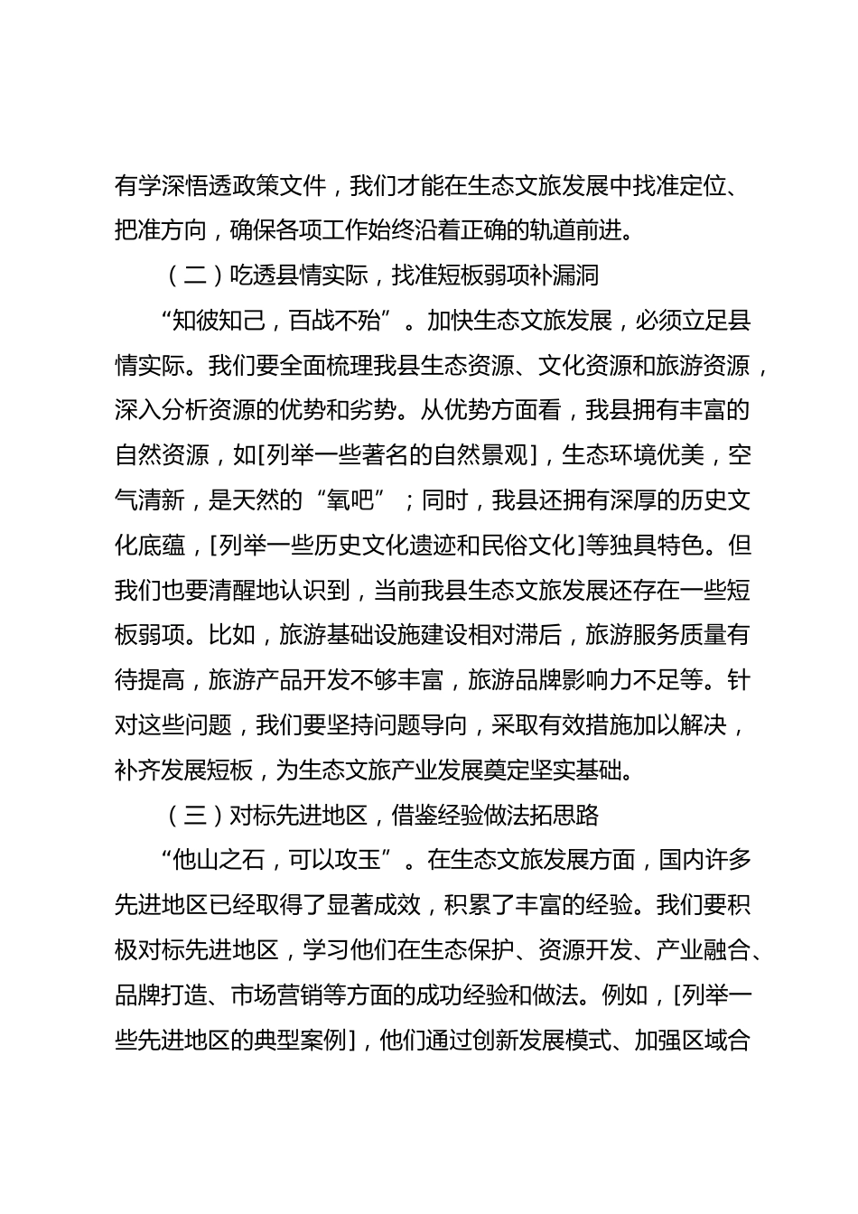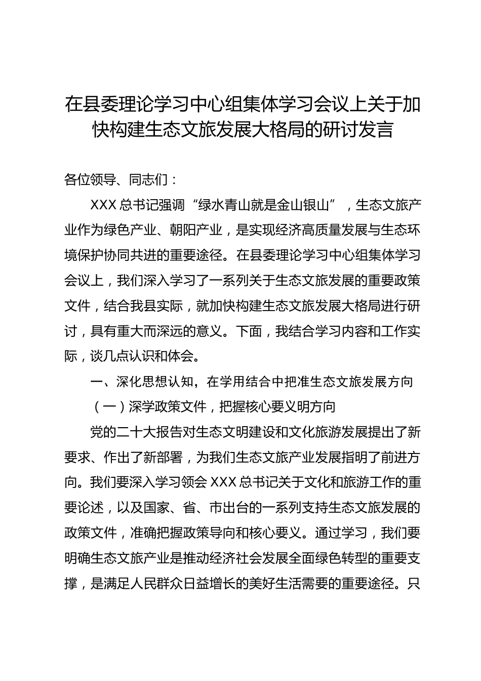 在縣委理論學(xué)習(xí)中心組集體學(xué)習(xí)會(huì)議上關(guān)于加快構(gòu)建生態(tài)文旅發(fā)展大格局的研討發(fā)言各位領(lǐng)導(dǎo)、同志們:XXX總書記強(qiáng)調(diào)“綠水青山就是金山銀山”,生態(tài)文旅產(chǎn)業(yè)作為綠色產(chǎn)業(yè)、朝陽(yáng)產(chǎn)業(yè),是實(shí)現(xiàn)經(jīng)濟(jì)高質(zhì)量發(fā)展與生態(tài)環(huán)境保護(hù)協(xié)同共進(jìn)的重要途徑。在縣委理論學(xué)習(xí)中心組集體學(xué)習(xí)會(huì)議上,我們深入學(xué)習(xí)了一系列關(guān)于生態(tài)文旅發(fā)展的重要政策文件,結(jié)合我縣實(shí)際,就加快構(gòu)建生態(tài)文旅發(fā)展大格局進(jìn)行研討,具有重大而深遠(yuǎn)的意義。下面,我結(jié)合學(xué)習(xí)內(nèi)容和工作實(shí)際,談幾點(diǎn)認(rèn)識(shí)和體會(huì)。一、深化思想認(rèn)知,在學(xué)用結(jié)合中把準(zhǔn)生態(tài)文旅發(fā)展方向(一)深學(xué)政策文件,把握核心要義明方向黨的二十...