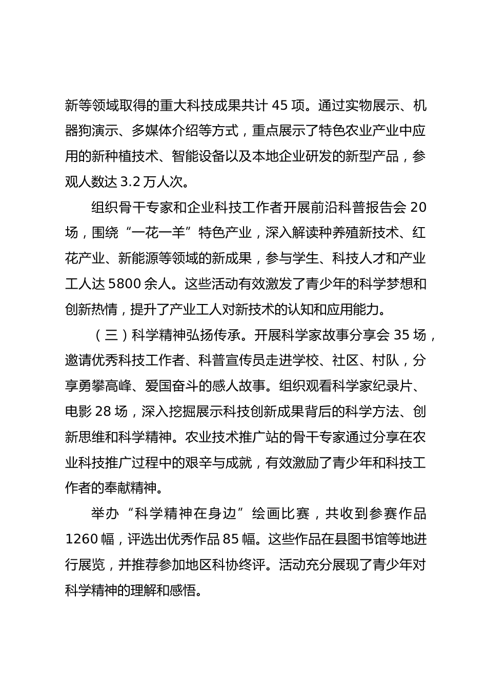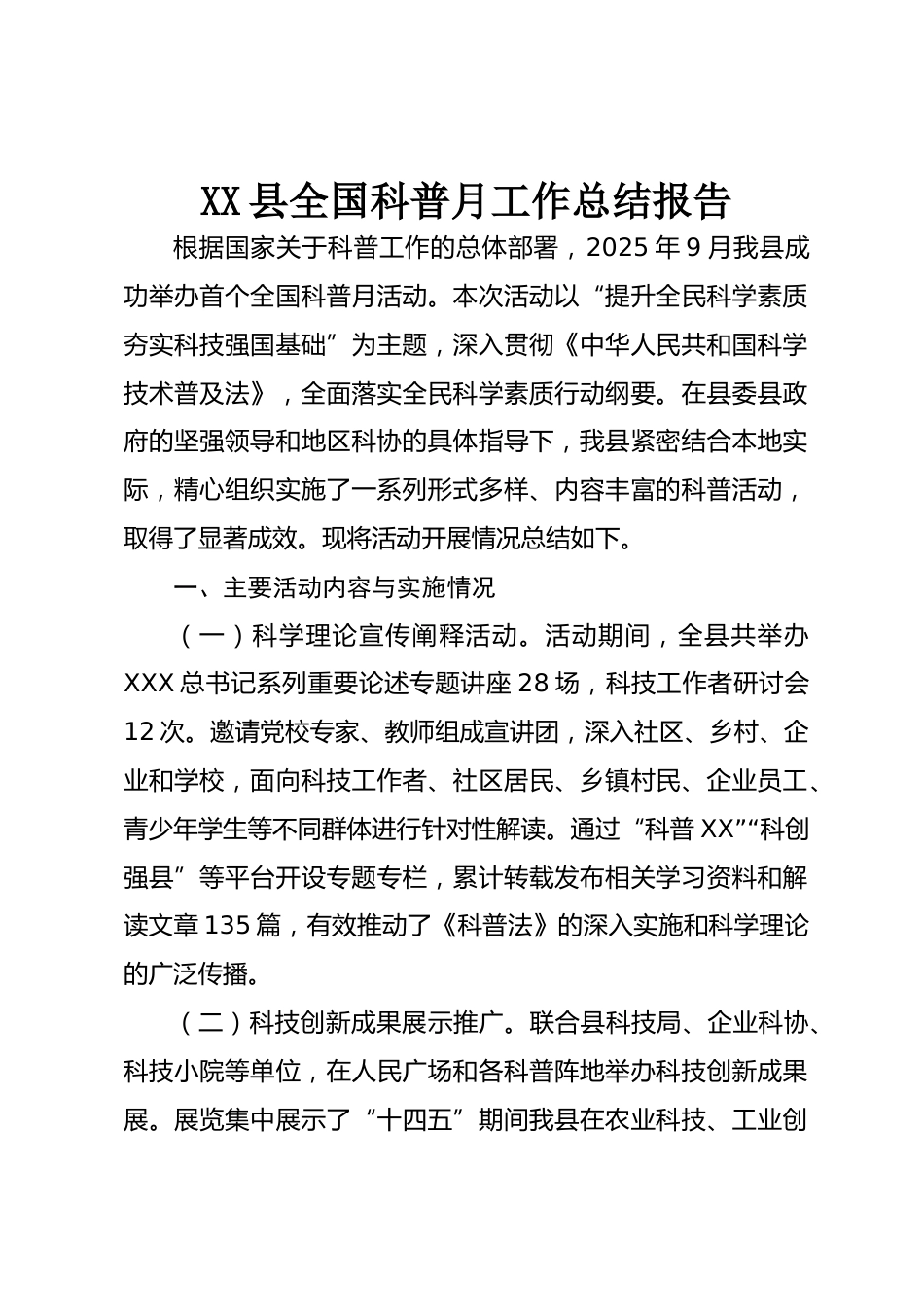 XX縣全國科普月工作總結(jié)報告根據(jù)國家關(guān)于科普工作的總體部署,2025年9月我縣成功舉辦首個全國科普月活動。本次活動以“提升全民科學素質(zhì)夯實科技強國基礎(chǔ)”為主題,深入貫徹《中華人民共和國科學技術(shù)普及法》,全面落實全民科學素質(zhì)行動綱要。在縣委縣政府的堅強領(lǐng)導(dǎo)和地區(qū)科協(xié)的具體指導(dǎo)下,我縣緊密結(jié)合本地實際,精心組織實施了一系列形式多樣、內(nèi)容豐富的科普活動,取得了顯著成效。現(xiàn)將活動開展情況總結(jié)如下。一、主要活動內(nèi)容與實施情況(一)科學理論宣傳闡釋活動。活動期間,全縣共舉辦XXX總書記系列重要論述專題講座28場,科技工作者研討會12次。邀請黨校專家、...