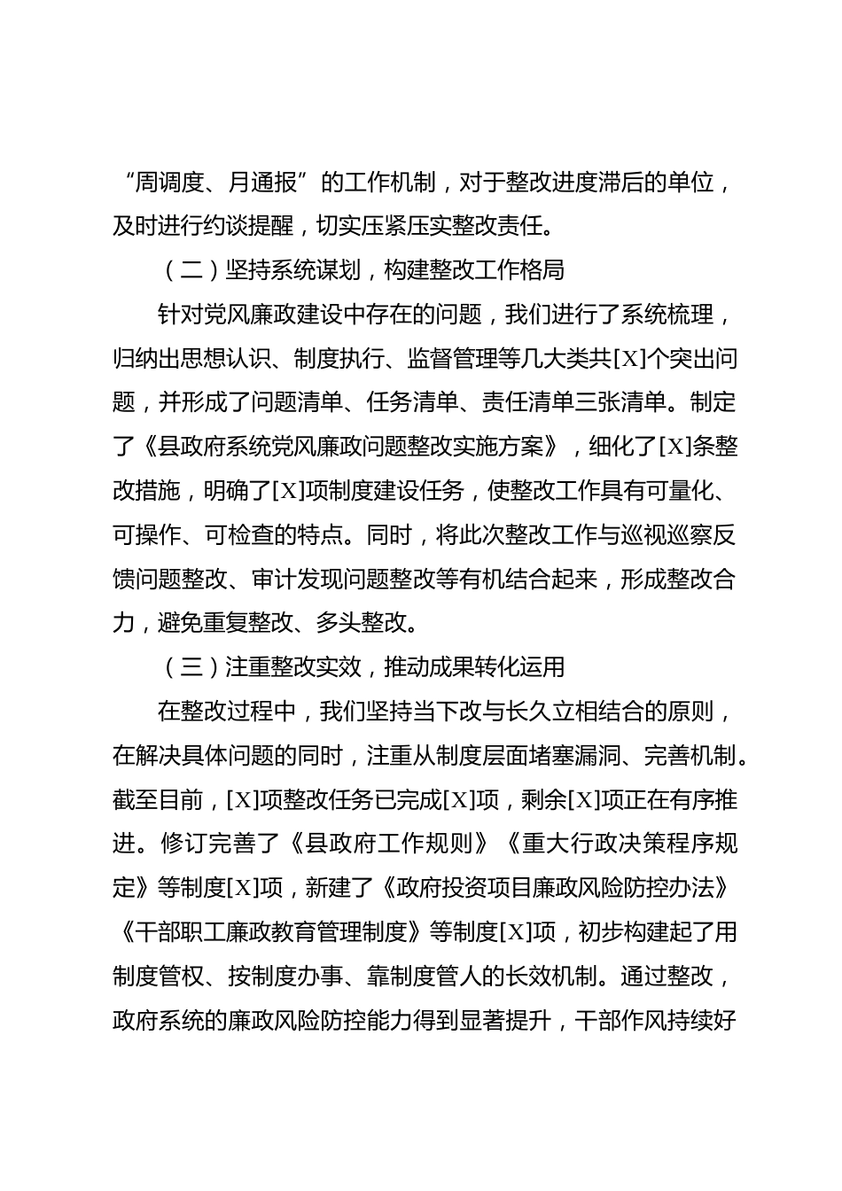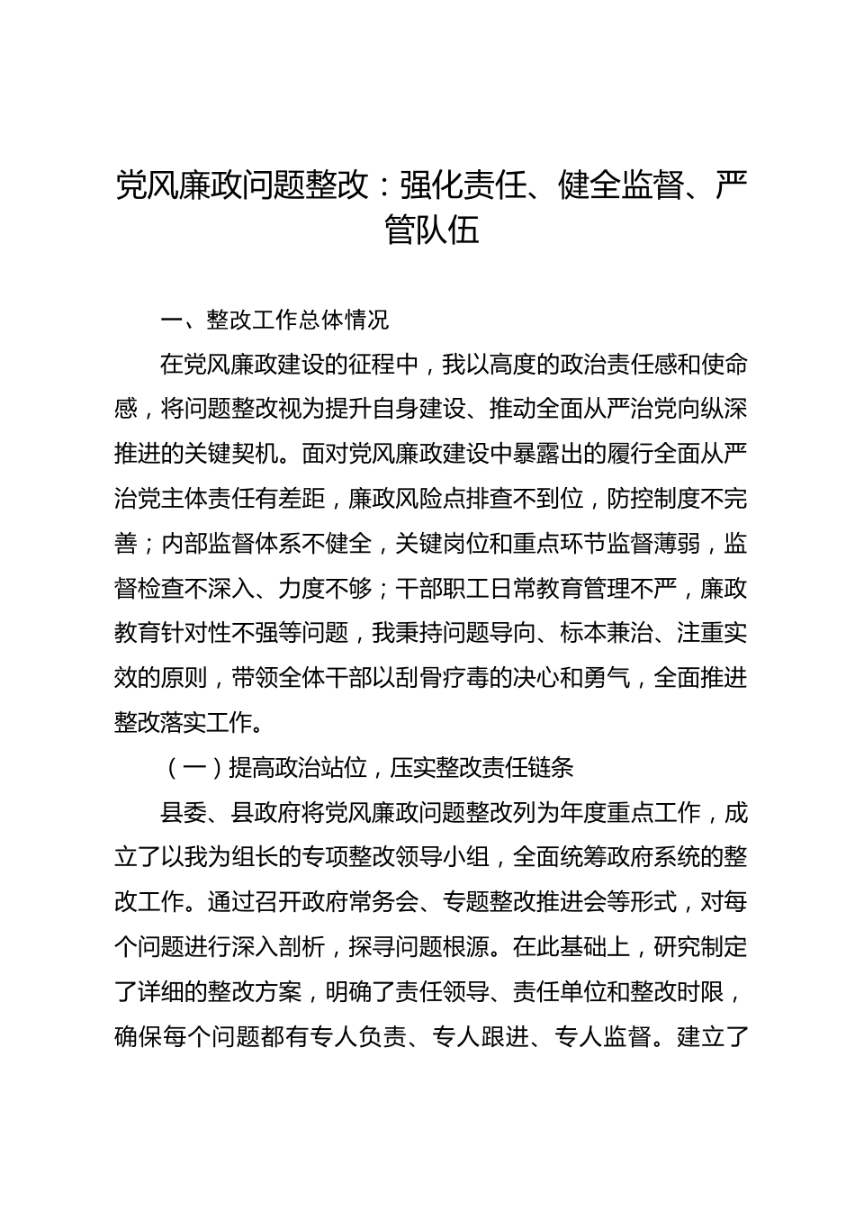 黨風(fēng)廉政問(wèn)題整改:強(qiáng)化責(zé)任、健全監(jiān)督、嚴(yán)管隊(duì)伍一、整改工作總體情況在黨風(fēng)廉政建設(shè)的征程中,我以高度的政治責(zé)任感和使命感,將問(wèn)題整改視為提升自身建設(shè)、推動(dòng)全面從嚴(yán)治黨向縱深推進(jìn)的關(guān)鍵契機(jī)。面對(duì)黨風(fēng)廉政建設(shè)中暴露出的履行全面從嚴(yán)治黨主體責(zé)任有差距,廉政風(fēng)險(xiǎn)點(diǎn)排查不到位,防控制度不完善;內(nèi)部監(jiān)督體系不健全,關(guān)鍵崗位和重點(diǎn)環(huán)節(jié)監(jiān)督薄弱,監(jiān)督檢查不深入、力度不夠;干部職工日常教育管理不嚴(yán),廉政教育針對(duì)性不強(qiáng)等問(wèn)題,我秉持問(wèn)題導(dǎo)向、標(biāo)本兼治、注重實(shí)效的原則,帶領(lǐng)全體干部以刮骨療毒的決心和勇氣,全面推進(jìn)整改落實(shí)工作。(一)提高政治站位,壓...