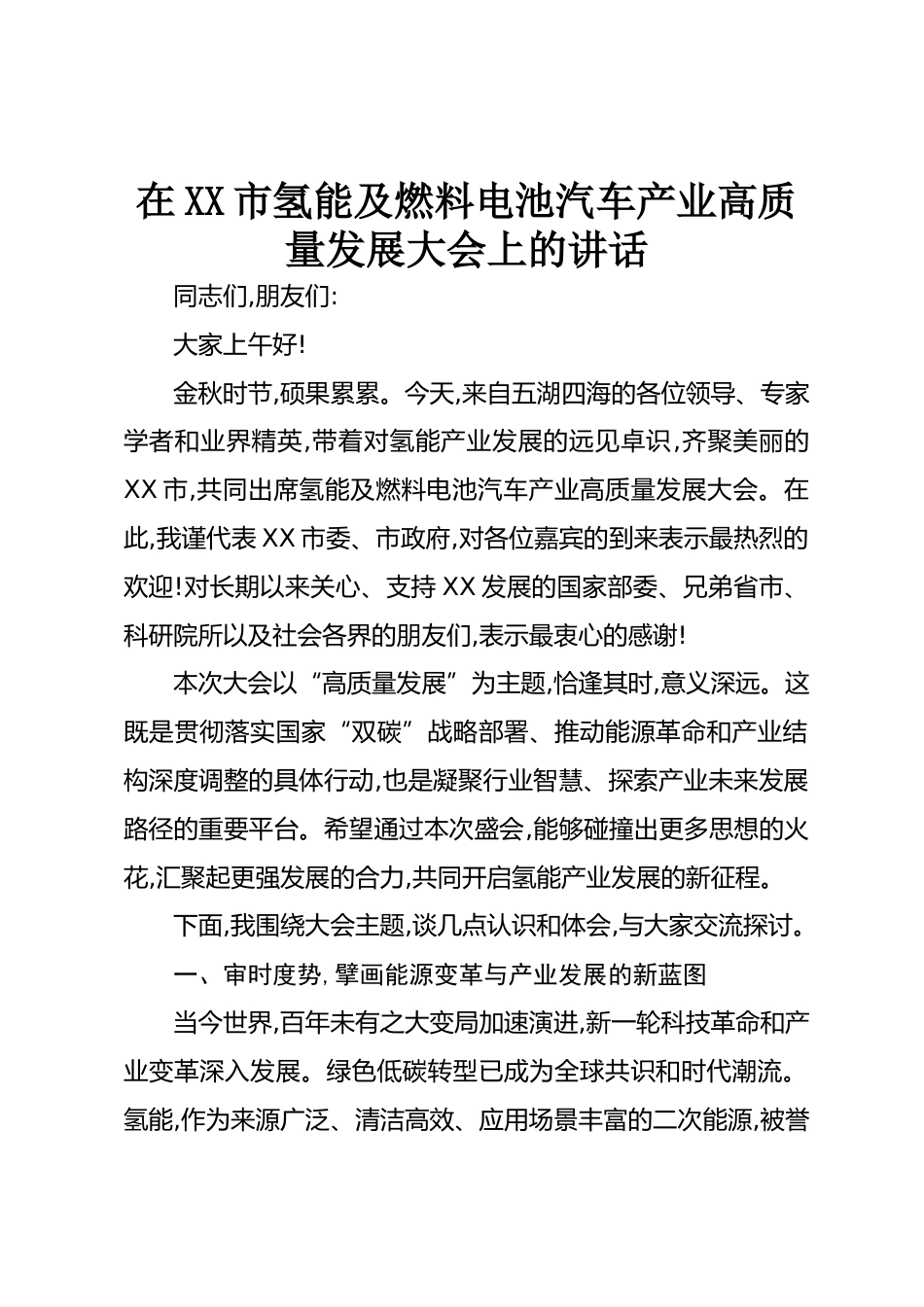 在XX市氫能及燃料電池汽車產(chǎn)業(yè)高質(zhì)量發(fā)展大會(huì)上的講話