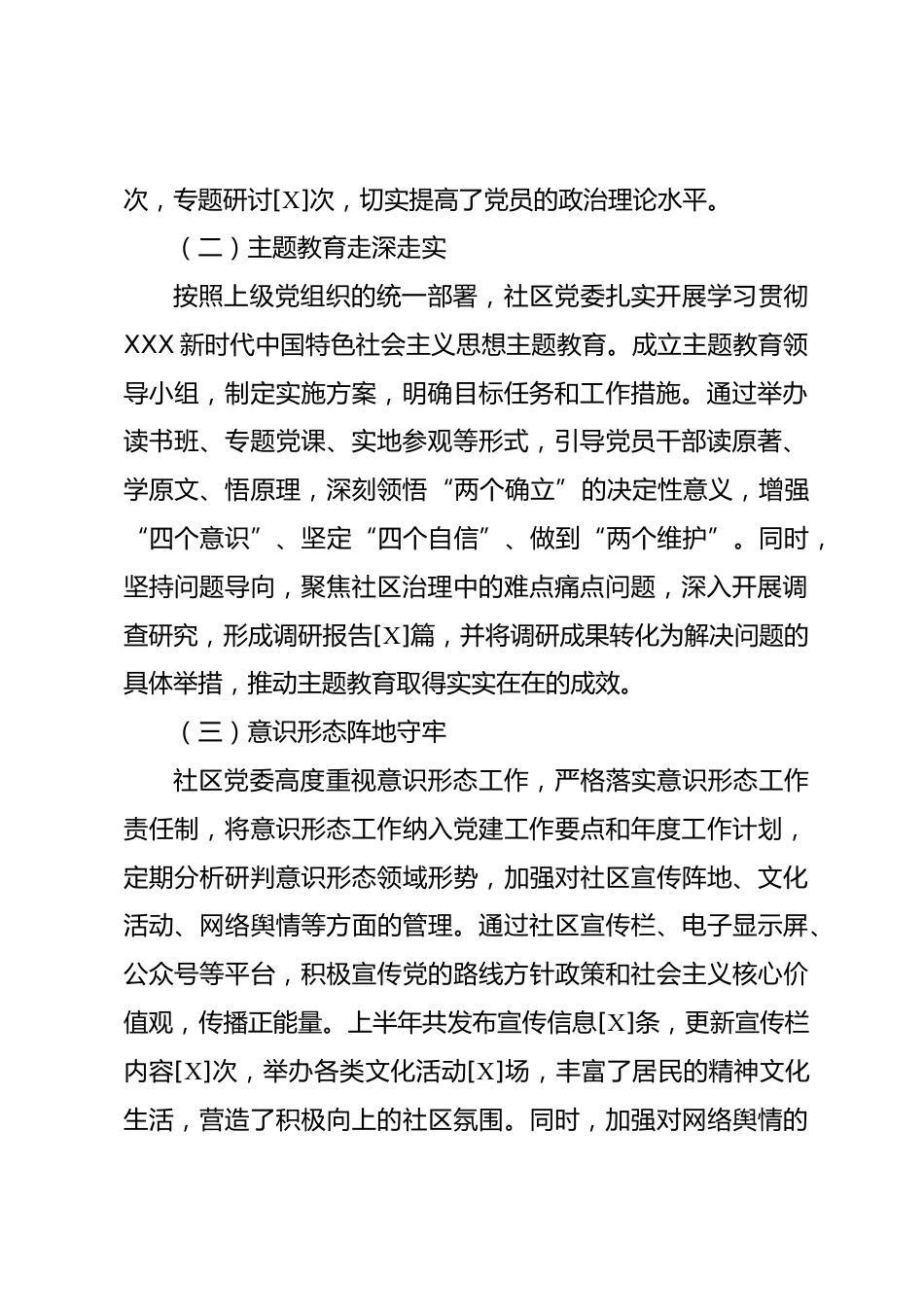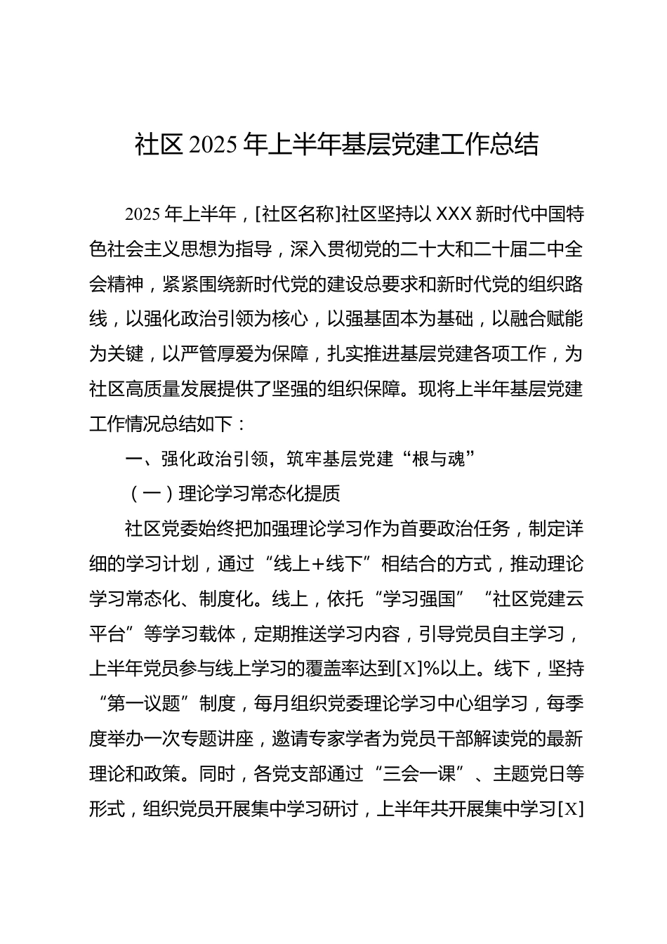 社區(qū)2025年上半年基層黨建工作總結(jié)2025年上半年,[社區(qū)名稱]社區(qū)堅(jiān)持以XXX新時(shí)代中國(guó)特色社會(huì)主義思想為指導(dǎo),深入貫徹黨的二十大和二十屆二中全會(huì)精神,緊緊圍繞新時(shí)代黨的建設(shè)總要求和新時(shí)代黨的組織路線,以強(qiáng)化政治引領(lǐng)為核心,以強(qiáng)基固本為基礎(chǔ),以融合賦能為關(guān)鍵,以嚴(yán)管厚愛為保障,扎實(shí)推進(jìn)基層黨建各項(xiàng)工作,為社區(qū)高質(zhì)量發(fā)展提供了堅(jiān)強(qiáng)的組織保障?,F(xiàn)將上半年基層黨建工作情況總結(jié)如下:一、強(qiáng)化政治引領(lǐng),筑牢基層黨建“根與魂”(一)理論學(xué)習(xí)常態(tài)化提質(zhì)社區(qū)黨委始終把加強(qiáng)理論學(xué)習(xí)作為首要政治任務(wù),制定詳細(xì)的學(xué)習(xí)計(jì)劃,通過“線上+線下”相結(jié)合的方式,推...