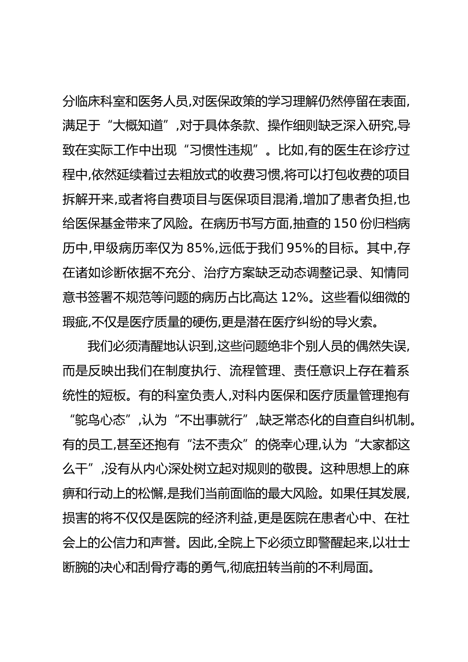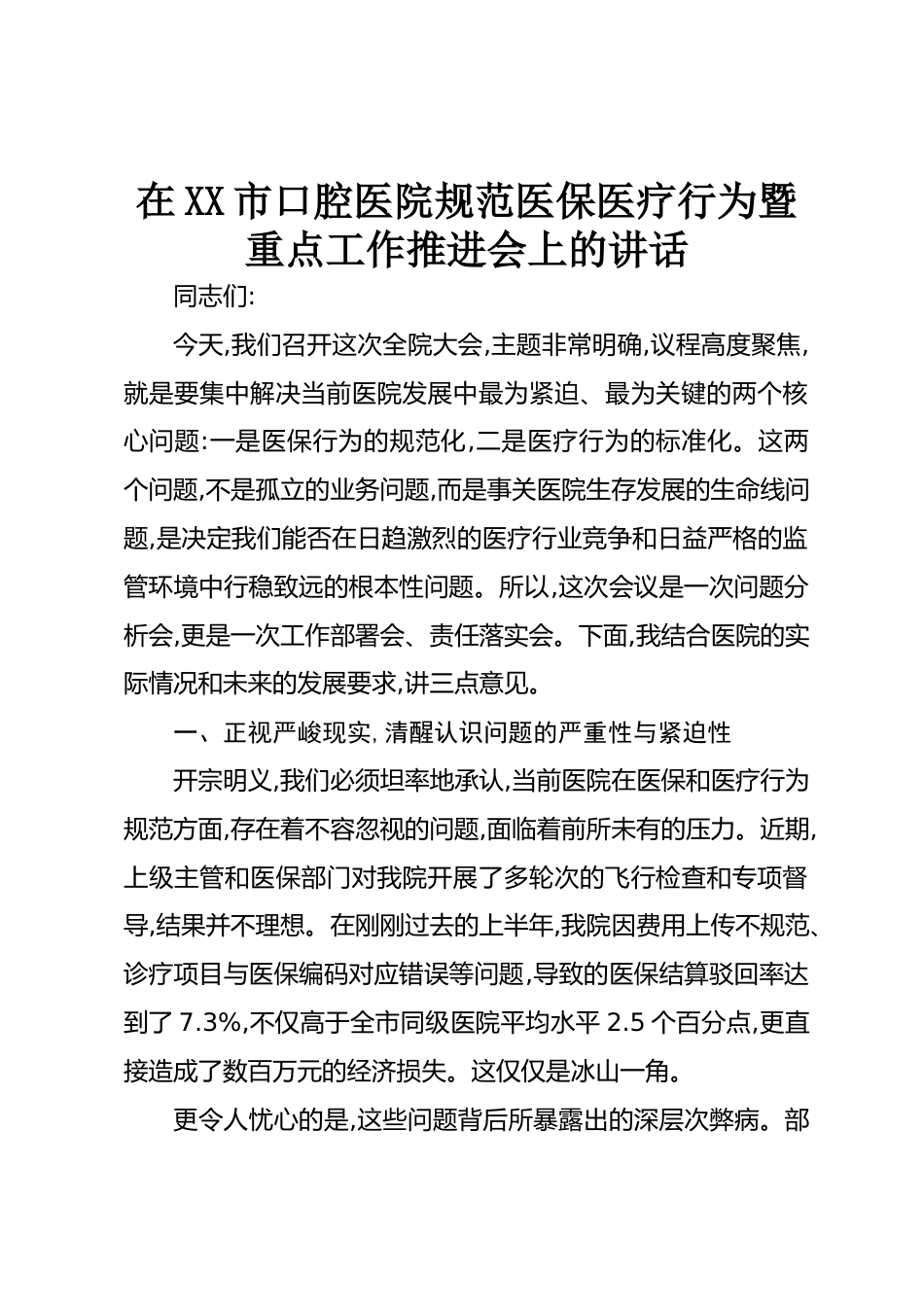 在XX市口腔醫(yī)院規(guī)范醫(yī)保醫(yī)療行為暨重點(diǎn)工作推進(jìn)會(huì)上的講話同志們:今天,我們召開(kāi)這次全院大會(huì),主題非常明確,議程高度聚焦,就是要集中解決當(dāng)前醫(yī)院發(fā)展中最為緊迫、最為關(guān)鍵的兩個(gè)核心問(wèn)題:一是醫(yī)保行為的規(guī)范化,二是醫(yī)療行為的標(biāo)準(zhǔn)化。這兩個(gè)問(wèn)題,不是孤立的業(yè)務(wù)問(wèn)題,而是事關(guān)醫(yī)院生存發(fā)展的生命線問(wèn)題,是決定我們能否在日趨激烈的醫(yī)療行業(yè)競(jìng)爭(zhēng)和日益嚴(yán)格的監(jiān)管環(huán)境中行穩(wěn)致遠(yuǎn)的根本性問(wèn)題。所以,這次會(huì)議是一次問(wèn)題分析會(huì),更是一次工作部署會(huì)、責(zé)任落實(shí)會(huì)。下面,我結(jié)合醫(yī)院的實(shí)際情況和未來(lái)的發(fā)展要求,講三點(diǎn)意見(jiàn)。一、正視嚴(yán)峻現(xiàn)實(shí),清醒認(rèn)識(shí)問(wèn)題的嚴(yán)重性與緊迫性開(kāi)宗明...