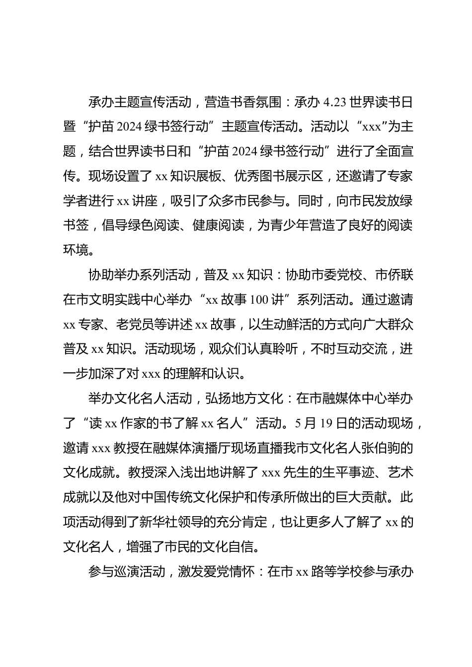 新華書店公司2024年工作總結(jié)及2025年工作安排一、2024年工作總結(jié)(一)發(fā)揮文化企業(yè)主陣地作用,依托“最美讀書聲”品牌開展活動,助力全市開展xxx學習教育今年以來,xx市新華書店有限公司圍繞慶祝xxx周年,按照全市慶祝xxx活動方案部署,公司在做好自身xxx學習教育的同時,依托“最美讀書聲”品牌,聯(lián)合xx市委宣傳部、市融媒體、市教體局、市僑聯(lián)等單位,運用新華百姓文化云,在全市范圍內(nèi)開展“最美讀書聲”系列活動,取得了良好的社會反響。舉辦誦讀活動,傳承紅色基因:先后深入到xxx學校、xx三中、xx小學、xx中學等組織舉辦“讀紅色經(jīng)典、做強國少年”為主題的誦讀...