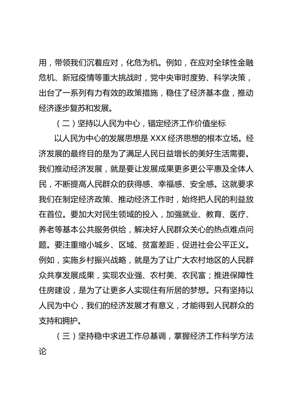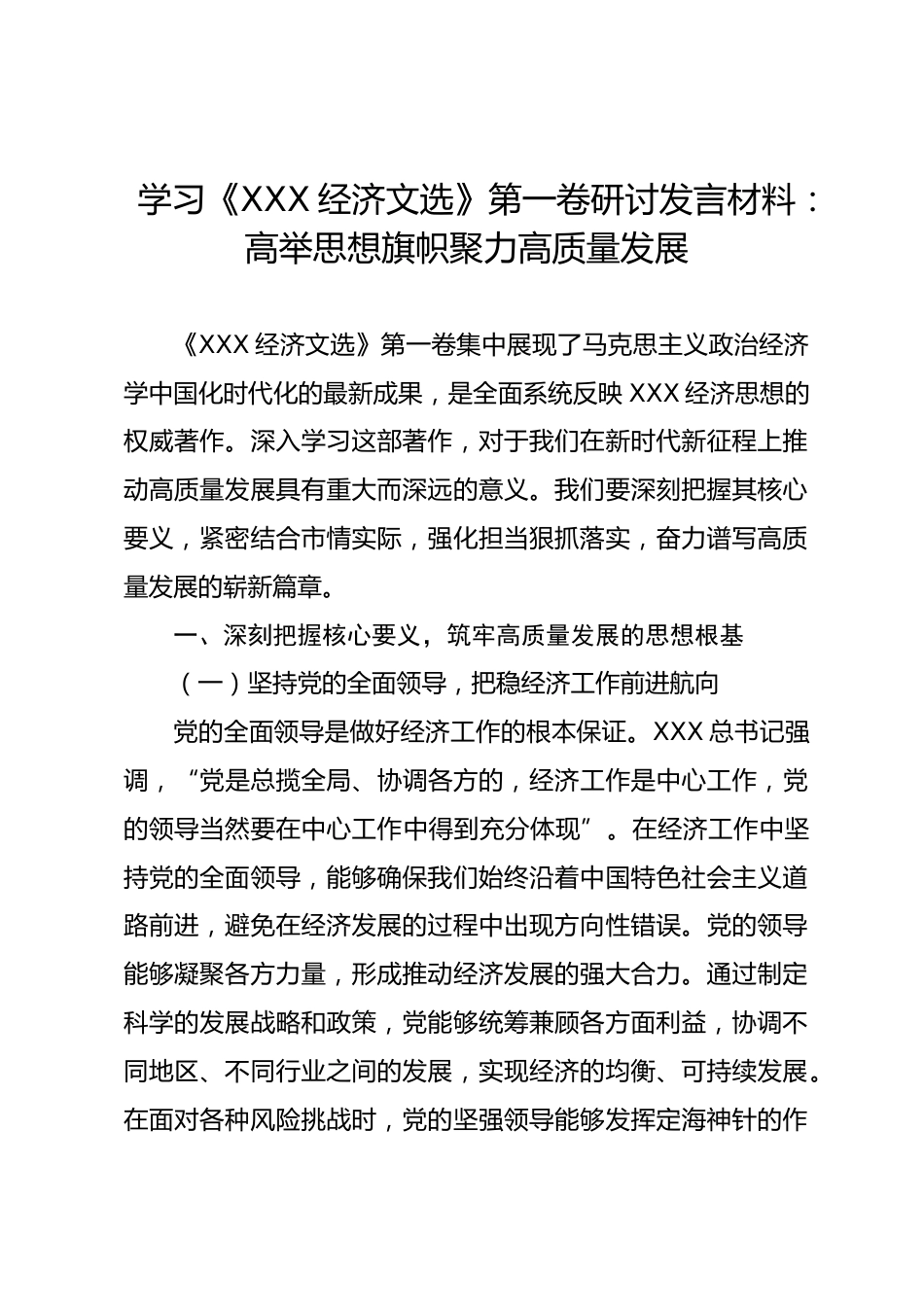 學(xué)習(xí)《XXX經(jīng)濟(jì)文選》第一卷研討發(fā)言材料:高舉思想旗幟聚力高質(zhì)量發(fā)展《XXX經(jīng)濟(jì)文選》第一卷集中展現(xiàn)了馬克思主義政治經(jīng)濟(jì)學(xué)中國(guó)化時(shí)代化的最新成果,是全面系統(tǒng)反映XXX經(jīng)濟(jì)思想的權(quán)威著作。深入學(xué)習(xí)這部著作,對(duì)于我們?cè)谛聲r(shí)代新征程上推動(dòng)高質(zhì)量發(fā)展具有重大而深遠(yuǎn)的意義。我們要深刻把握其核心要義,緊密結(jié)合市情實(shí)際,強(qiáng)化擔(dān)當(dāng)狠抓落實(shí),奮力譜寫(xiě)高質(zhì)量發(fā)展的嶄新篇章。一、深刻把握核心要義,筑牢高質(zhì)量發(fā)展的思想根基(一)堅(jiān)持黨的全面領(lǐng)導(dǎo),把穩(wěn)經(jīng)濟(jì)工作前進(jìn)航向黨的全面領(lǐng)導(dǎo)是做好經(jīng)濟(jì)工作的根本保證。XXX總書(shū)記強(qiáng)調(diào),“黨是總攬全局、協(xié)調(diào)各方的,經(jīng)濟(jì)工作是中...