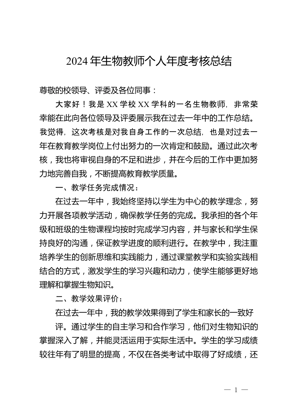 2024年生物教師個(gè)人年度考核總結(jié)尊敬的校領(lǐng)導(dǎo)、評(píng)委及各位同事:大家好!我是XX學(xué)校XX學(xué)科的一名生物教,非常榮師幸能在此向各位領(lǐng)導(dǎo)及評(píng)委展示我在過去一年中的工作總結(jié)。我得,次考核是我自身工作的一次,也是去一覺這對(duì)總結(jié)對(duì)過年在教育教學(xué)崗位上付出努力的一次肯定和鼓勵(lì)。通過此次考核,我也將審視自身的不足和進(jìn)步,并在今后的工作中更加努力地完善自我,不斷提高教育教學(xué)質(zhì)量。一、教學(xué)任務(wù)完成情況:在過去一年中,我始終堅(jiān)持以學(xué)生為中心的教學(xué)理念,努力開展各項(xiàng)教學(xué)活動(dòng),確保教學(xué)任務(wù)的完成。我承擔(dān)的各個(gè)年級(jí)和班級(jí)的生物課程均按時(shí)完成學(xué)習(xí)內(nèi)容,并與家長(zhǎng)...