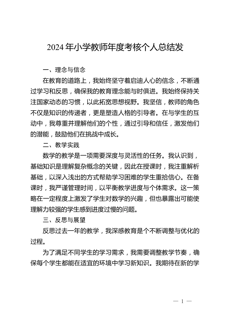 2024年小學教師年度考核個人總結(jié)發(fā)一、理念與信念在教育的道路上,我始終堅守著啟迪人心的信念,不斷通過學習和反思,確保我的教育理念能與時俱進。我始終保持關注國家動態(tài)的習慣,以此拓寬思想視野。我堅信,教師的角色不僅是知識的傳遞者,更是塑造人格的引導者。在與學生的互動中,我尊重并理解他們的個性,通過引導和信任,激發(fā)他們的潛能,鼓勵他們在挑戰(zhàn)中成長。二、教學實踐數(shù)學的教學是一項需要深度與靈活性的任務。我認識到,基礎知識是理解復雜概念的關鍵,因此在授課時,我注重解析基礎,以深入淺出的方式幫助學習困難的學生重拾信心。在備課時,我嚴謹管理時...