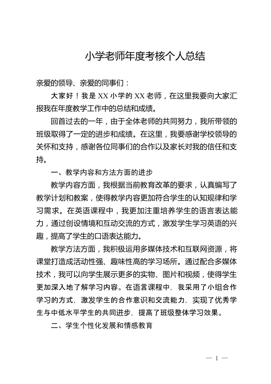 小學老師年度考核個人總結親愛的領導、親愛的同事們:大家好!我是XX小學的XX老師,在這里我要向大家匯報我在年度教學工作中的總結和成績?;厥走^去的一年,由于全體老師的共同努力,我所帶領的班級取得了一定的進步和成績。在這里,我要感謝學校領導的關懷和支持,感謝各位同事們的合作以及家長對我的信任和支持。一、教學內容和方法方面的進步教學內容方面,我根據(jù)當前教育改革的要求,認真編寫了教學計劃和教案,使得教學內容更加符合學生的認知規(guī)律和學習需求。在英語課程中,我更加注重培養(yǎng)學生的語言表達能力,通過創(chuàng)設情境和互動交流的方式,激發(fā)學生學習英語的興...
