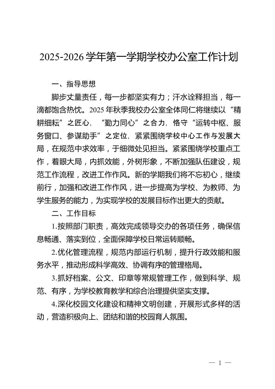 2025-2026學(xué)年第一學(xué)期學(xué)校辦公室工作計(jì)劃一、指導(dǎo)思想腳步丈量責(zé)任,每一步都堅(jiān)實(shí)有力;汗水詮釋擔(dān)當(dāng),每一滴都飽含熱忱。2025年秋季我校辦公室全體同仁將繼續(xù)以“精耕細(xì)耘”之匠心,“勤力同心”之合力,恪守“運(yùn)轉(zhuǎn)中樞、服務(wù)窗口、參謀助手”之定位,學(xué)校中心工作與展大緊緊圍繞發(fā)局,在規(guī)范中求效率,于細(xì)微處見(jiàn)擔(dān)當(dāng)。緊緊圍繞學(xué)校重點(diǎn)工作,著眼大局,內(nèi)抓效能,外樹(shù)形象,不斷加強(qiáng)隊(duì)伍建設(shè),規(guī)范工作流程,改進(jìn)工作作風(fēng)。新的學(xué)期我們將不忘初心,繼續(xù)前行,加強(qiáng)和改進(jìn)工作作風(fēng),進(jìn)一步提高為學(xué)校、為教師、為學(xué)生服務(wù)的能力,為實(shí)現(xiàn)學(xué)校的發(fā)展目標(biāo)作出更大的貢獻(xiàn)...