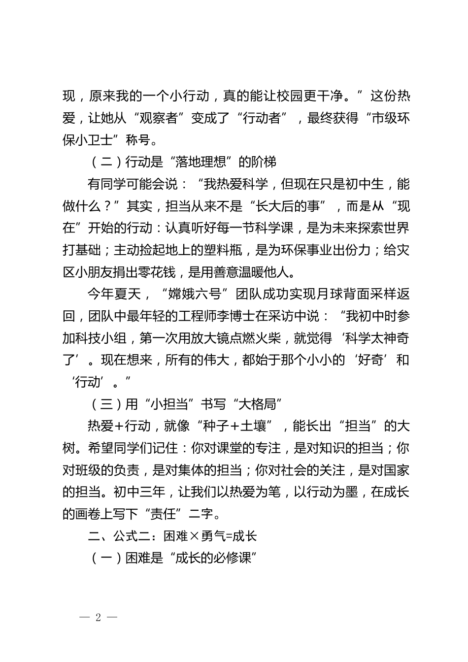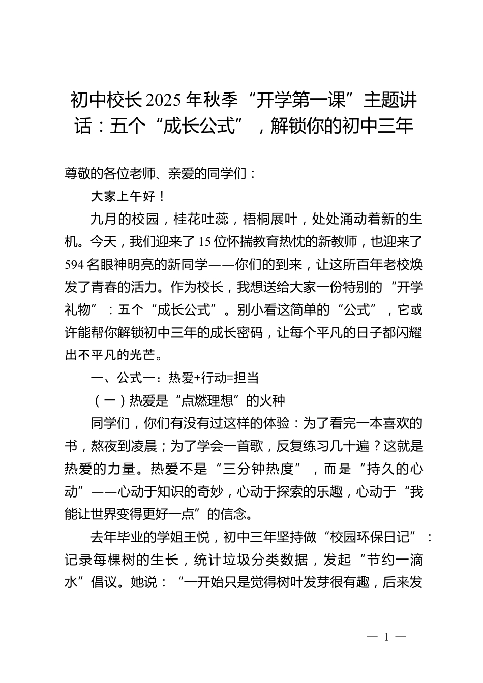 初中校長(zhǎng)2025年秋季“開(kāi)學(xué)第一課”主題講話:五個(gè)“成長(zhǎng)公式”,解鎖你的初中三年尊敬的各位老師、親愛(ài)的同學(xué)們:大家上午好!九月的校園,桂花吐蕊,梧桐展葉,處處涌動(dòng)著新的生機(jī)。今天,我們迎來(lái)了15位懷揣教育熱忱的新教師,也迎來(lái)了594名眼神明亮的新同學(xué)——你們的到來(lái),讓這所百年老校煥發(fā)了青春的活力。作為校長(zhǎng),我想送給大家一份特別的“開(kāi)學(xué)禮物”:五個(gè)“成長(zhǎng)公式”。別小看這簡(jiǎn)單的“公式”,它或許能幫你解鎖初中三年的成長(zhǎng)密碼,讓每個(gè)平凡的日子都閃耀出不平凡的光芒。一、公式一:熱愛(ài)+行動(dòng)=擔(dān)當(dāng)(一)熱愛(ài)是“點(diǎn)燃理想”的火種同學(xué)們,你們有沒(méi)有過(guò)這...