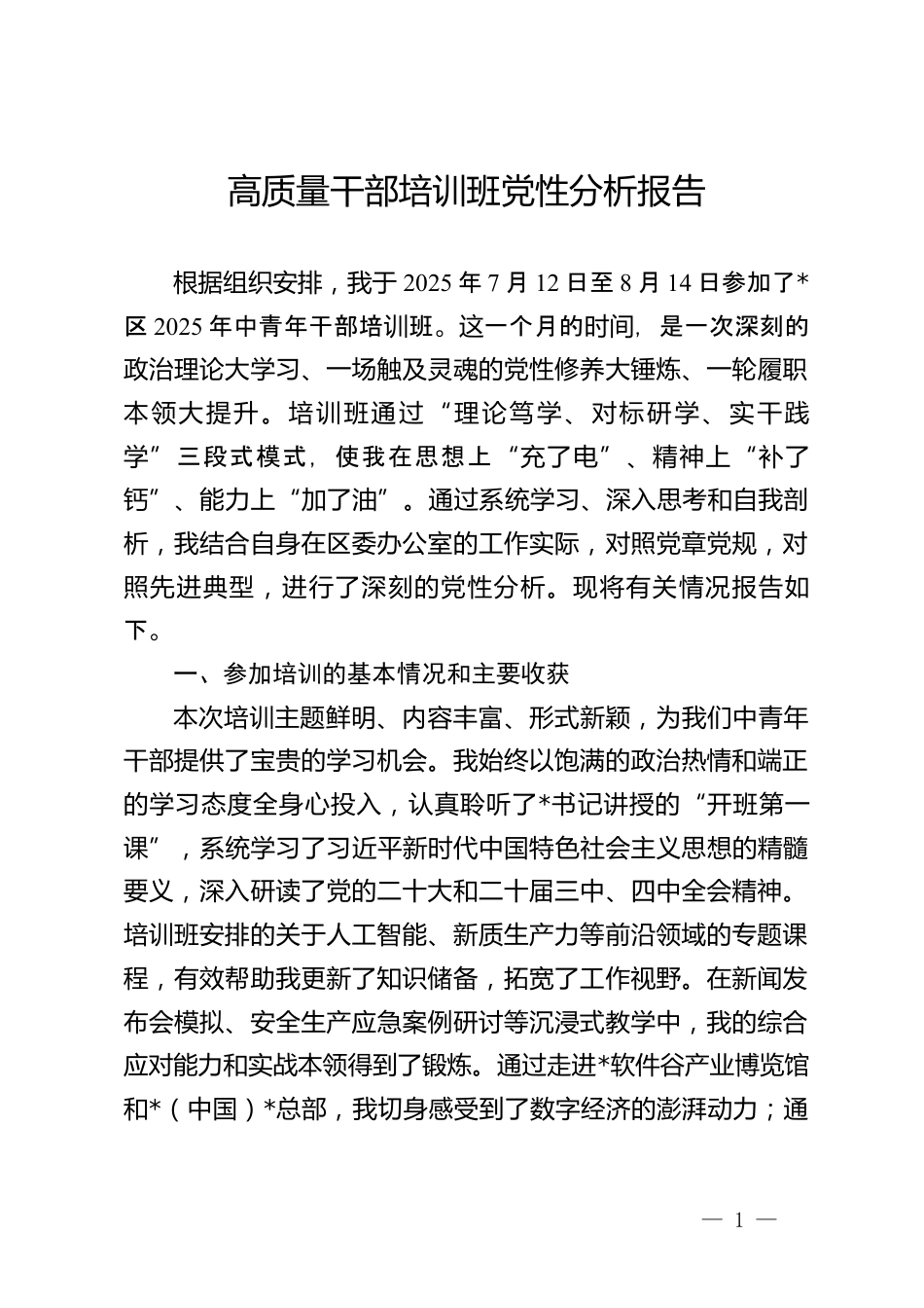 高質(zhì)量干部培訓班黨性分析報告根據(jù)組織安排,我于2025年7月12日至8月14日參加了*區(qū)2025年中青年干部培班。一個月的,是一次深刻的訓這時間政治理論大學習、一場觸及靈魂的黨性修養(yǎng)大錘煉、一輪履職本領大提升。培訓班通過“理論篤學、對標研學、實干踐學”三段式模式,使我在思想上“充了電”、精神上“補了鈣”、能力上“加了油”。通過系統(tǒng)學習、深入思考和自我剖析,我結合自身在區(qū)委辦公室的工作實際,對照黨章黨規(guī),對照先進典型,進行了深刻的黨性分析?,F(xiàn)將有關情況報告如下。一、參加培訓的基本情況和主要收獲本次培訓主題鮮明、內(nèi)容豐富、形式新穎,為我們中青...