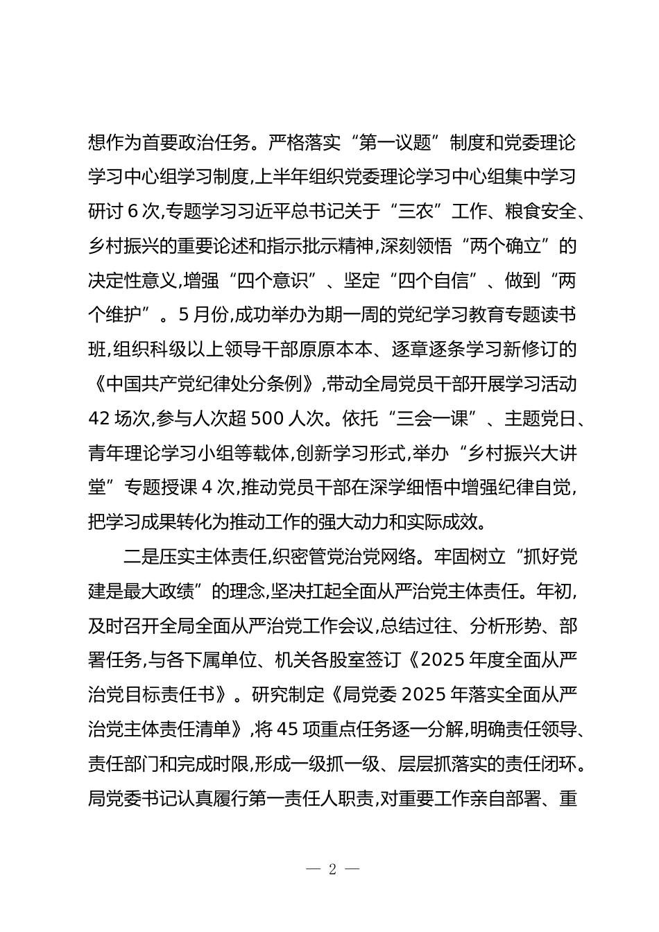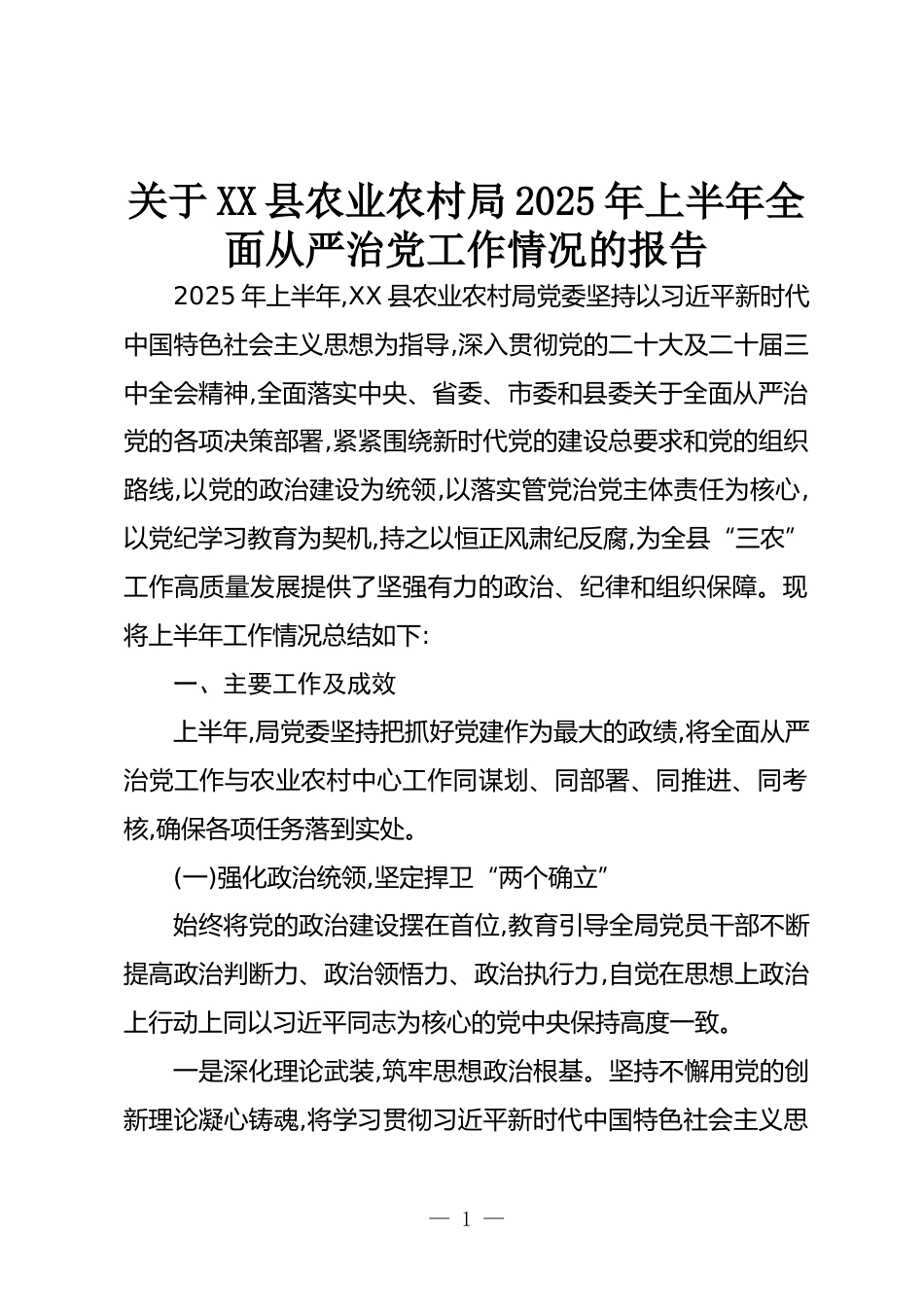 關(guān)于XX縣農(nóng)業(yè)農(nóng)村局2025年上半年全面從嚴(yán)治黨工作情況的報(bào)告2025年上半年,XX縣農(nóng)業(yè)農(nóng)村局黨委堅(jiān)持以習(xí)近平新時代中國特色社會主義思想為指導(dǎo),深入貫徹黨的二十大及二十屆三中全會精神,全面落實(shí)中央、省委、市委和縣委關(guān)于全面從嚴(yán)治黨的各項(xiàng)決策部署,緊緊圍繞新時代黨的建設(shè)總要求和黨的組織路線,以黨的政治建設(shè)為統(tǒng)領(lǐng),以落實(shí)管黨治黨主體責(zé)任為核心,以黨紀(jì)學(xué)習(xí)教育為契機(jī),持之以恒正風(fēng)肅紀(jì)反腐,為全縣“三農(nóng)”工作高質(zhì)量發(fā)展提供了堅(jiān)強(qiáng)有力的政治、紀(jì)律和組織保障?,F(xiàn)將上半年工作情況總結(jié)如下:一、主要工作及成效上半年,局黨委堅(jiān)持把抓好黨建作為最大的政績,將全面從嚴(yán)...