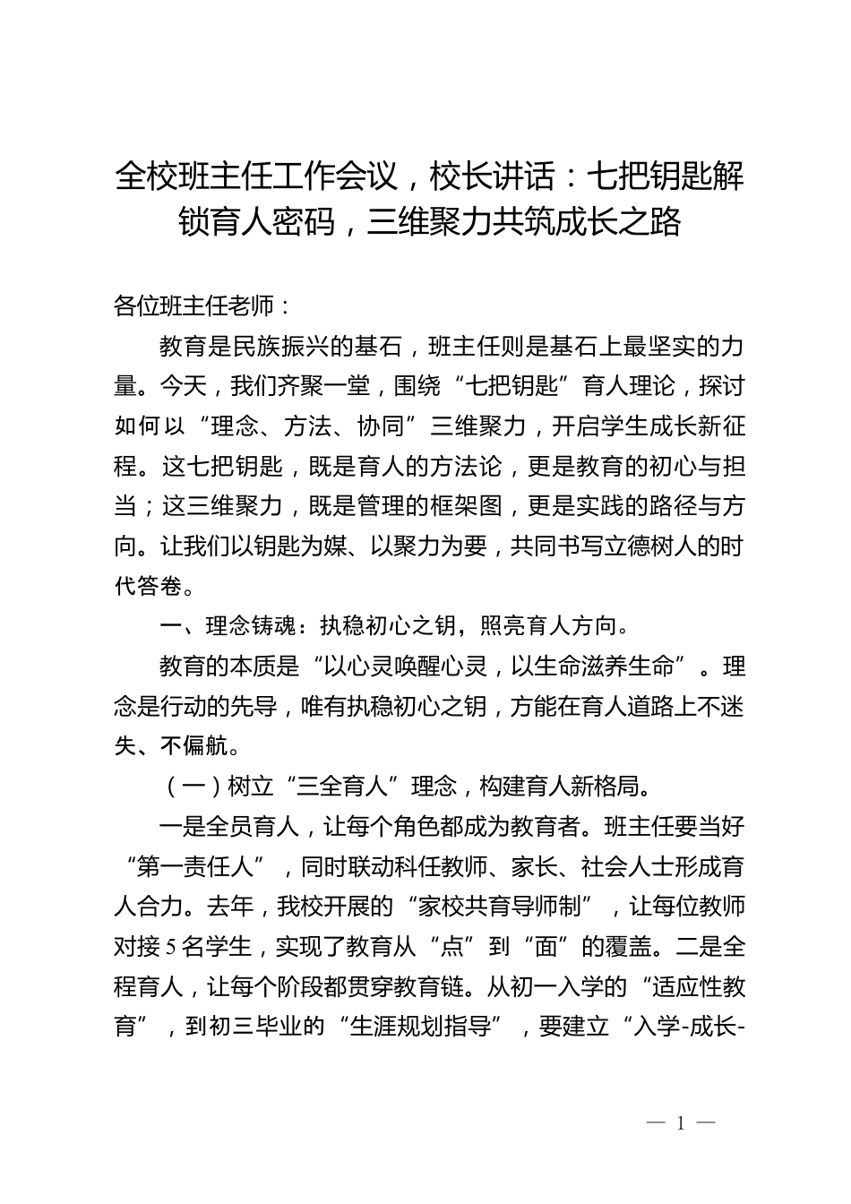全校班主任工作會議,校長講話:七把鑰匙解鎖育人密碼,三維聚力共筑成長之路各位班主任老師:教育是民族振興的基石,班主任則是基石上最堅實的力量。今天,我們齊聚一堂,圍繞“七把鑰匙”育人理論,探討如何以“理念、方法、協(xié)同”三維聚力,開啟學生成長新征程。這七把鑰匙,既是育人的方法論,更是教育的初心與擔當;這三維聚力,既是管理的框架圖,更是實踐的路徑與方向。讓我們以鑰匙為媒、以聚力為要,共同書寫立德樹人的時代答卷。一、理念鑄魂:執(zhí)穩(wěn)初心之鑰,照亮育人方向。教育的本質是“以心靈喚醒心靈,以生命滋養(yǎng)生命”。理念是行動的先導,唯有執(zhí)穩(wěn)初心之...