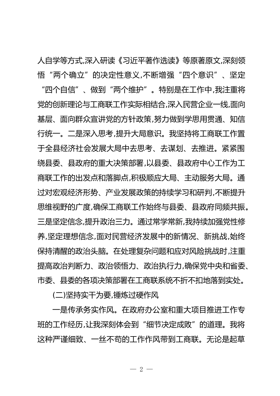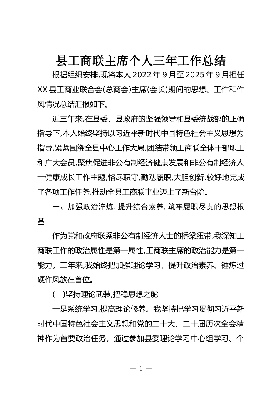 縣工商聯(lián)主席個人三年工作總結(jié)根據(jù)組織安排,現(xiàn)將本人2022年9月至2025年9月?lián)蝀X縣工商業(yè)聯(lián)合會(總商會)主席(會長)期間的思想、工作和作風(fēng)情況總結(jié)匯報如下。近三年來,在縣委、縣政府的堅強領(lǐng)導(dǎo)和縣委統(tǒng)戰(zhàn)部的正確指導(dǎo)下,本人始終堅持以習(xí)近平新時代中國特色社會主義思想為指導(dǎo),緊緊圍繞全縣中心工作大局,團結(jié)帶領(lǐng)工商聯(lián)全體干部職工和廣大會員,聚焦促進非公有制經(jīng)濟健康發(fā)展和非公有制經(jīng)濟人士健康成長工作主題,恪盡職守,勤勉履職,大膽創(chuàng)新,較好地完成了各項工作任務(wù),推動全縣工商聯(lián)事業(yè)邁上了新臺階。一、加強政治淬煉,提升綜合素養(yǎng),筑牢履職盡責(zé)的思想根基作為黨和政...