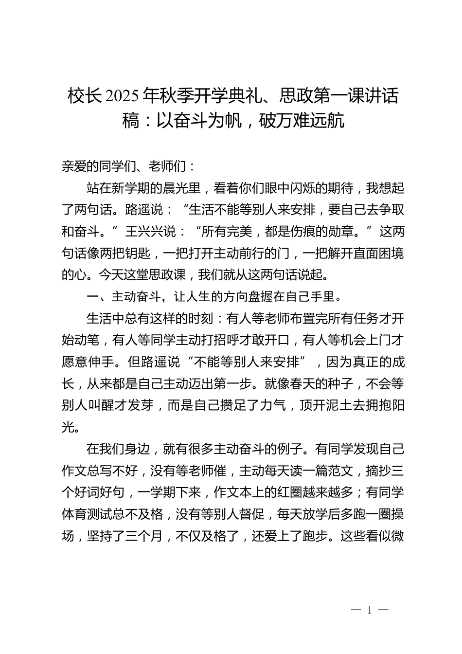 校長2025年秋季開學(xué)典禮、思政第一課講話稿:以奮斗為帆,破萬難遠航親愛的同學(xué)們、老師們:站在新學(xué)期的晨光里,看著你們眼中閃爍的期待,我想起了兩句話。路遙說:“生活不能等別人來安排,要自己去爭取和奮斗?!蓖跖d興說:“所有完美,都是傷痕的勛章?!边@兩句話像兩把鑰匙,一把打開主動前行的門,一把解開直面困境的心。今天這堂思政課,我們就從這兩句話說起。一、主動奮斗,讓人生的方向盤握在自己手里。生活中總有這樣的時刻:有人等老師布置完所有任務(wù)才開始動筆,有人等同學(xué)主動打招呼才敢開口,有人等機會上門才愿意伸手。但路遙說“不能等別人來安排”,因...