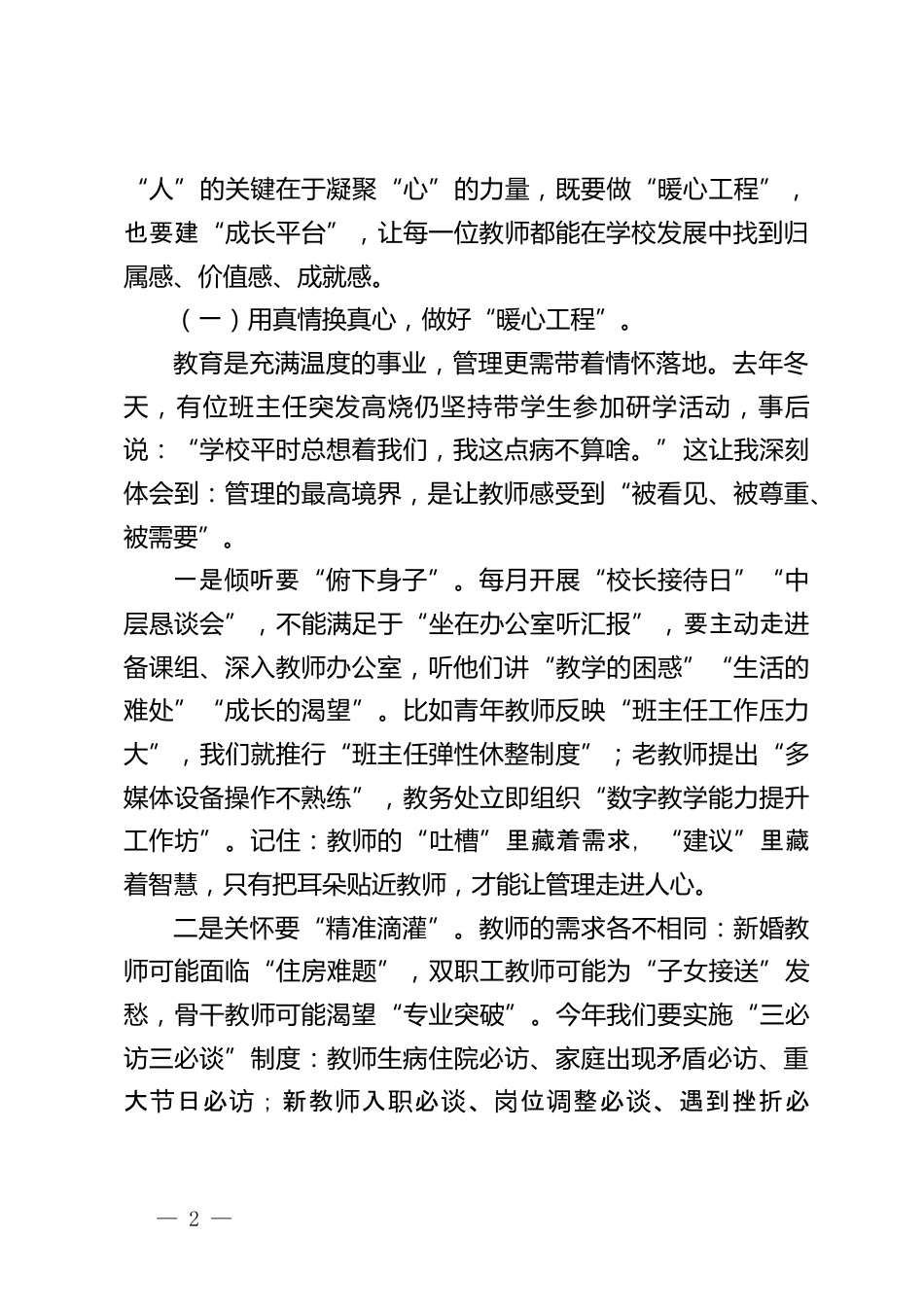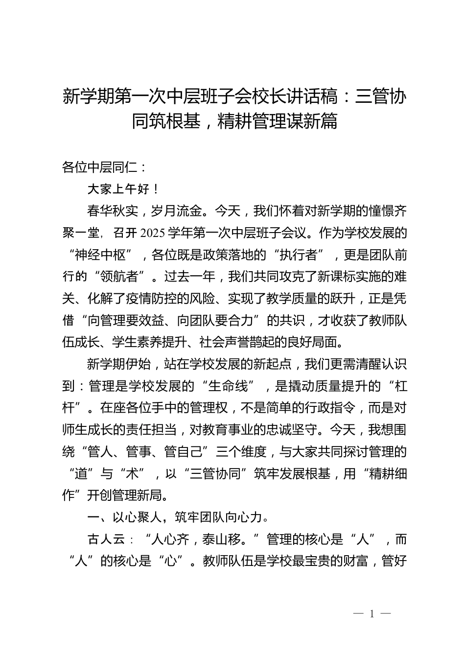 新學(xué)期第一次中層班子會校長講話稿:三管協(xié)同筑根基,精耕管理謀新篇各位中層同仁:大家上午好!春華秋實,歲月流金。今天,我們懷著對新學(xué)期的憧憬齊聚一堂,召開2025學(xué)年第一次中層班子會議。作為學(xué)校發(fā)展的“神經(jīng)中樞”,各位既是政策落地的“執(zhí)行者”,更是團隊前行的“領(lǐng)航者”。過去一年,我們共同攻克了新課標實施的難關(guān)、化解了疫情防控的風(fēng)險、實現(xiàn)了教學(xué)質(zhì)量的躍升,正是憑借“向管理要效益、向團隊要合力”的共識,才收獲了教師隊伍成長、學(xué)生素養(yǎng)提升、社會聲譽鵲起的良好局面。新學(xué)期伊始,站在學(xué)校發(fā)展的新起點,我們更需清醒認識到:管理是學(xué)校發(fā)展的“生...