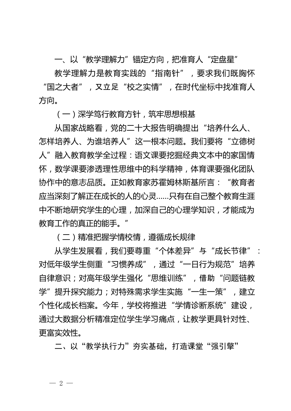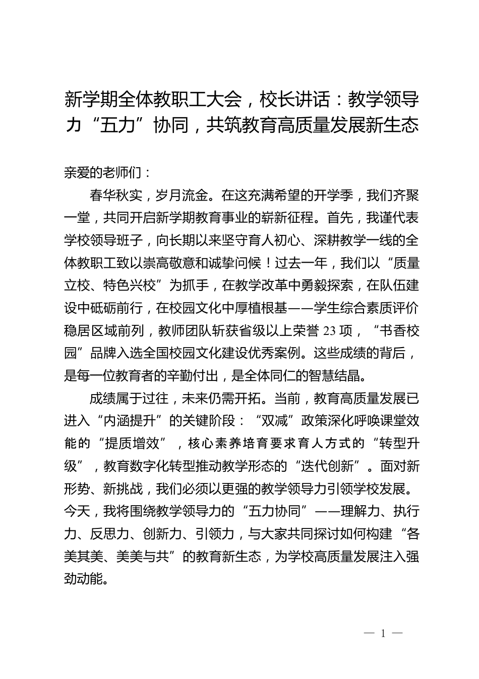 新學期全體教職工大會,校長講話:教學領導力“五力”協(xié)同,共筑教育高質量發(fā)展新生態(tài)親愛的老師們:春華秋實,歲月流金。在這充滿希望的開學季,我們齊聚一堂,共同開啟新學期教育事業(yè)的嶄新征程。首先,我謹代表學校領導班子,向長期以來堅守育人初心、深耕教學一線的全體教職工致以崇高敬意和誠摯問候!過去一年,我們以“質量立校、特色興?!睘樽ナ?,在教學改革中勇毅探索,在隊伍建設中砥礪前行,在校園文化中厚植根基——學生綜合素質評價穩(wěn)居區(qū)域前列,教師團隊斬獲省級以上榮譽23項,“書香校園”品牌入選全國校園文化建設優(yōu)秀案例。這些成績的背后,是每一位教...