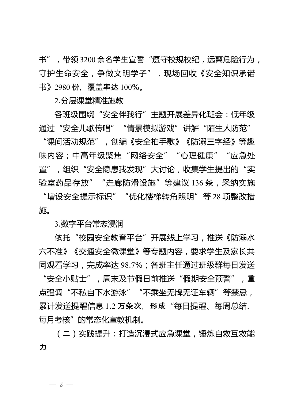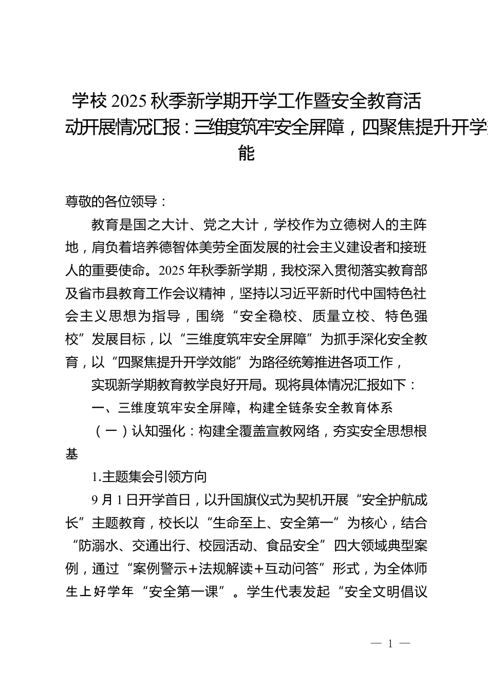 學校2025秋季新學期開學工作暨安全教育活動開展情況匯報:三維度筑牢安全屏障,四聚焦提升開學效能尊敬的各位領(lǐng)導:教育是國之大計、黨之大計,學校作為立德樹人的主陣地,肩負著培養(yǎng)德智體美勞全面發(fā)展的社會主義建設(shè)者和接班人的重要使命。2025年秋季新學期,我校深入貫徹落實教育部及省市縣教育工作會議精神,堅持以習近平新時代中國特色社會主義思想為指導,圍繞“安全穩(wěn)校、質(zhì)量立校、特色強校”發(fā)展目標,以“三維度筑牢安全屏障”為抓手深化安全教育,以“四聚焦提升開學效能”為路徑統(tǒng)籌推進各項工作,實現(xiàn)新學期教育教學良好開局?,F(xiàn)將具體情況匯報如下:一、三...