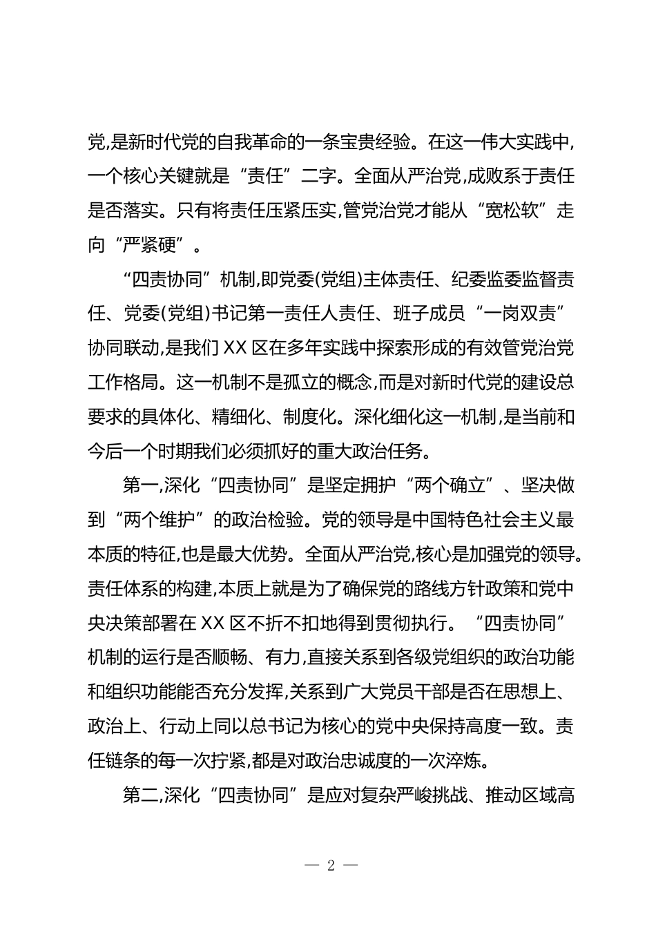 在XX區(qū)深化細(xì)化全面從嚴(yán)治黨“四責(zé)協(xié)同”機(jī)制推進(jìn)會上的講話同志們:今天,我們召開全區(qū)深化細(xì)化全面從嚴(yán)治黨“四責(zé)協(xié)同”機(jī)制推進(jìn)會,主要任務(wù)是深入學(xué)習(xí)貫徹總書記關(guān)于黨的自我革命的重要思想,堅(jiān)決貫徹落實(shí)二十屆中央紀(jì)委四次全會精神,總結(jié)經(jīng)驗(yàn)、分析形勢、部署任務(wù),以更堅(jiān)定的決心、更務(wù)實(shí)的舉措、更協(xié)同的合力,推動我區(qū)全面從嚴(yán)治黨向縱深發(fā)展,為奮力譜寫中國式現(xiàn)代化XX實(shí)踐嶄新篇章提供堅(jiān)強(qiáng)有力的政治保障和紀(jì)律保障。剛才,XX局、XX鎮(zhèn)、XX街道三家單位的負(fù)責(zé)同志作了很好的交流發(fā)言,分享了各自在落實(shí)“四責(zé)協(xié)同”機(jī)制方面的探索和成效,聽后很受啟發(fā)。這些經(jīng)驗(yàn)做法,既體...