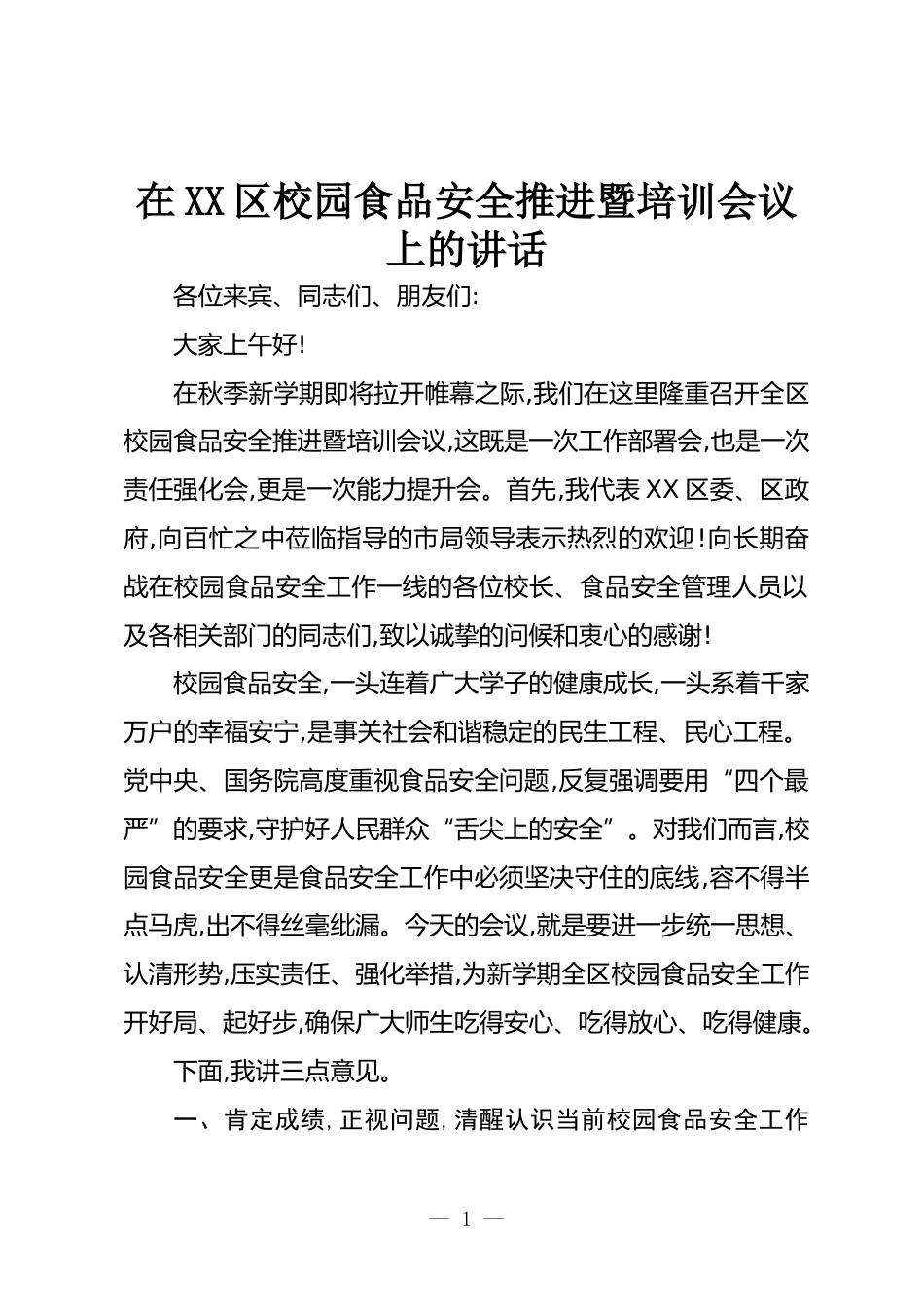 在XX區(qū)校園食品安全推進(jìn)暨培訓(xùn)會議上的講話