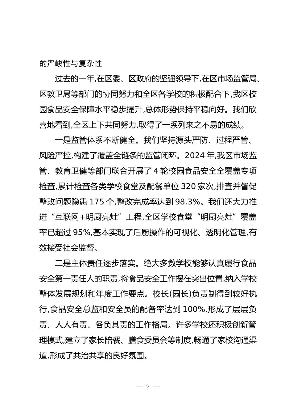 在XX區(qū)校園食品安全推進(jìn)暨培訓(xùn)會議上的講話各位來賓、同志們、朋友們:大家上午好!在秋季新學(xué)期即將拉開帷幕之際,我們在這里隆重召開全區(qū)校園食品安全推進(jìn)暨培訓(xùn)會議,這既是一次工作部署會,也是一次責(zé)任強(qiáng)化會,更是一次能力提升會。首先,我代表XX區(qū)委、區(qū)政府,向百忙之中蒞臨指導(dǎo)的市局領(lǐng)導(dǎo)表示熱烈的歡迎!向長期奮戰(zhàn)在校園食品安全工作一線的各位校長、食品安全管理人員以及各相關(guān)部門的同志們,致以誠摯的問候和衷心的感謝!校園食品安全,一頭連著廣大學(xué)子的健康成長,一頭系著千家萬戶的幸福安寧,是事關(guān)社會和諧穩(wěn)定的民生工程、民心工程。黨中央、國務(wù)院高度重視食品安全...