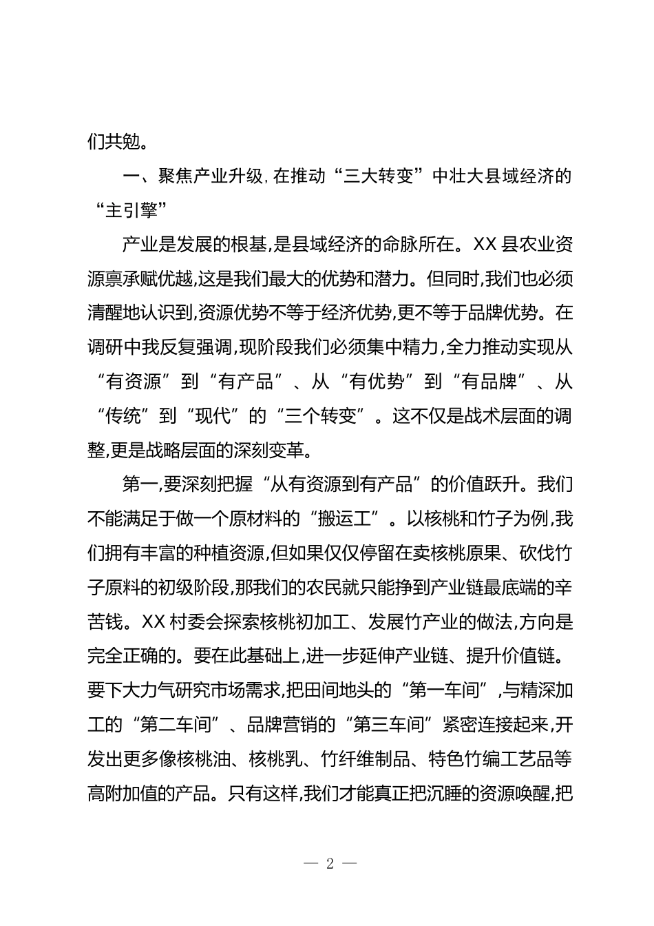 在XX市赴XX縣調(diào)研工作座談會上的講話同志們:根據(jù)市委的統(tǒng)一安排,8月15日,我和市里的幾位同志一道,到XX縣進行了為期一天的專題調(diào)研。我們先后深入XX莊園、XX鎮(zhèn)XX村易地搬遷安置點、XX鄉(xiāng)XX村委會、XX鄉(xiāng)集鎮(zhèn)等地,實地察看了特色產(chǎn)業(yè)發(fā)展、鄉(xiāng)村振興、農(nóng)業(yè)水價改革、防汛和地質(zhì)災害防治等工作情況,并與基層干部、企業(yè)負責人和群眾代表進行了深入的交流。今天,我們召開這個座談會,主要目的是在實地調(diào)研的基礎(chǔ)上,和大家一起交流思想、分析問題、明確方向,共同推動XX縣的經(jīng)濟社會發(fā)展再上新臺階??偟膩砜?這次調(diào)研給我留下了深刻而美好的印象。我欣喜地看到,XX縣的廣大干部群眾...