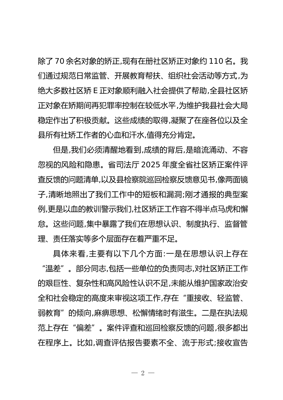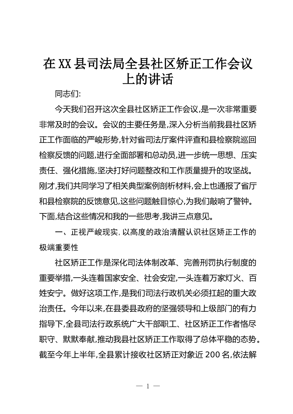 在XX縣司法局全縣社區(qū)矯正工作會(huì)議上的講話同志們:今天我們召開(kāi)這次全縣社區(qū)矯正工作會(huì)議,是一次非常重要非常及時(shí)的會(huì)議。會(huì)議的主要任務(wù)是,深入分析當(dāng)前我縣社區(qū)矯正工作面臨的嚴(yán)峻形勢(shì),針對(duì)省司法廳案件評(píng)查和縣檢察院巡回檢察反饋的問(wèn)題,進(jìn)行全面部署和總動(dòng)員,進(jìn)一步統(tǒng)一思想、壓實(shí)責(zé)任、強(qiáng)化措施,堅(jiān)決打好問(wèn)題整改和工作質(zhì)量提升的攻堅(jiān)戰(zhàn)。剛才,我們共同學(xué)習(xí)了相關(guān)典型案例剖析材料,會(huì)上也通報(bào)了省廳和縣檢察院的反饋意見(jiàn),這些問(wèn)題觸目驚心,為我們敲響了警鐘。下面,結(jié)合這些情況和我的一些思考,我講三點(diǎn)意見(jiàn)。一、正視嚴(yán)峻現(xiàn)實(shí),以高度的政治清醒認(rèn)識(shí)社區(qū)矯正工作的極...