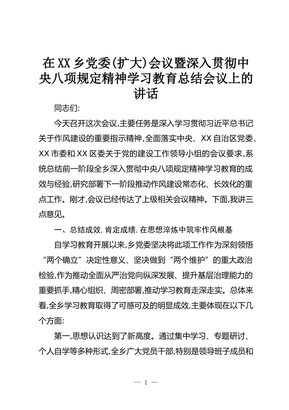 在XX鄉(xiāng)黨委(擴(kuò)大)會議暨深入貫徹中央八項規(guī)定精神學(xué)習(xí)教育總結(jié)會議上的講話