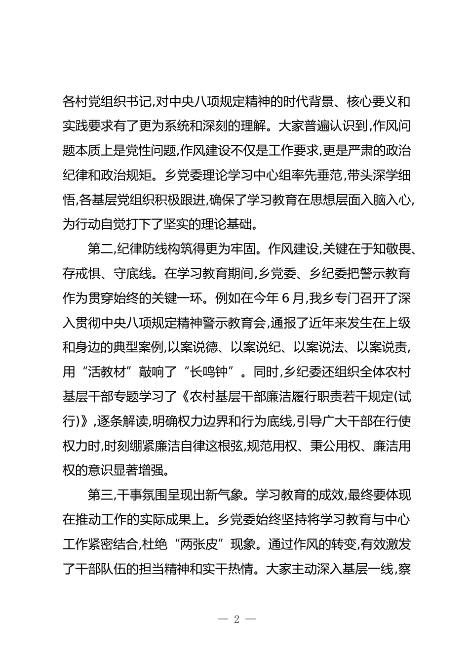 在XX鄉(xiāng)黨委(擴(kuò)大)會議暨深入貫徹中央八項規(guī)定精神學(xué)習(xí)教育總結(jié)會議上的講話同志們:今天召開這次會議,主要任務(wù)是深入學(xué)習(xí)貫徹習(xí)近平總書記關(guān)于作風(fēng)建設(shè)的重要指示精神,全面落實中央、XX自治區(qū)黨委、XX市委和XX區(qū)委關(guān)于黨的建設(shè)工作領(lǐng)導(dǎo)小組的會議要求,系統(tǒng)總結(jié)前一階段全鄉(xiāng)深入貫徹中央八項規(guī)定精神學(xué)習(xí)教育的成效與經(jīng)驗,研究部署下一階段推動作風(fēng)建設(shè)常態(tài)化、長效化的重點工作。剛才,會議已經(jīng)傳達(dá)了上級相關(guān)會議精神。下面,我講三點意見。一、總結(jié)成效,肯定成績,在思想淬煉中筑牢作風(fēng)根基自學(xué)習(xí)教育開展以來,鄉(xiāng)黨委堅決將此項工作作為深刻領(lǐng)悟“兩個確立”決定性意義、堅...