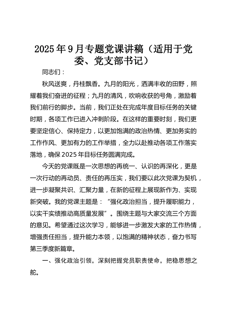 2025年9月專題黨課講稿(適用于黨委、黨支部書記)