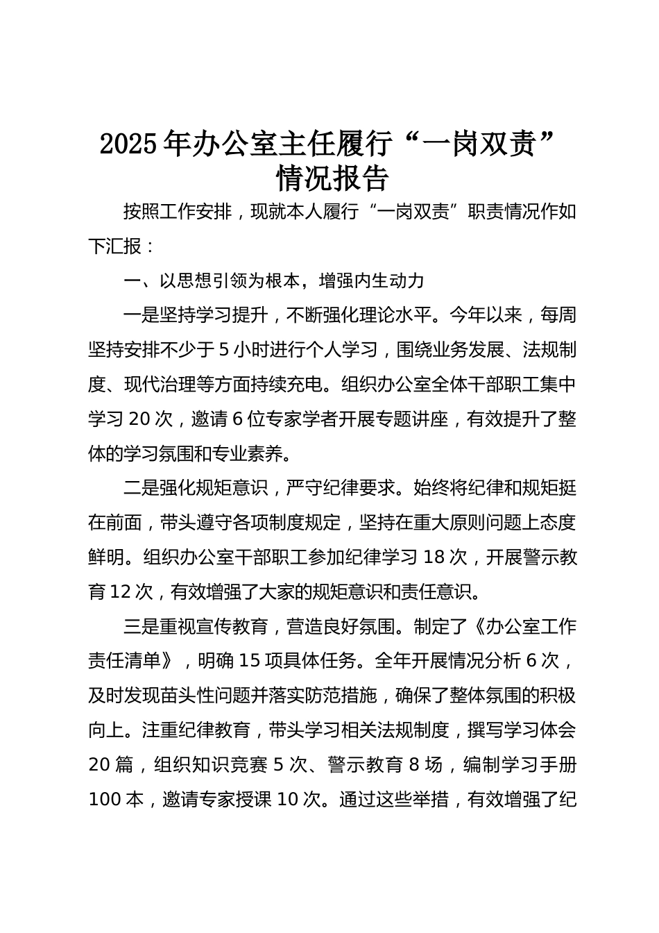 2025年辦公室主任履行“一崗雙責(zé)”情況報告