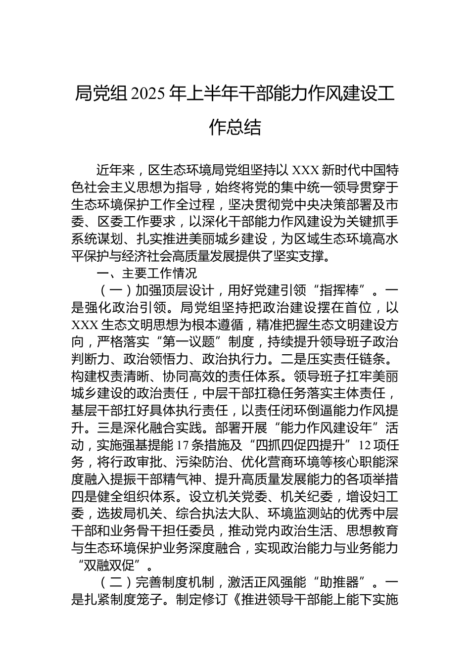 2025年上半年干部能力作風(fēng)建設(shè)工作總結(jié)(2篇)目錄1.局黨組2025年上半年干部能力作風(fēng)建設(shè)工作總結(jié)...............22.區(qū)委2025年上半年干部能力作風(fēng)建設(shè)工作總結(jié).................7局黨組2025年上半年干部能力作風(fēng)建設(shè)工作總結(jié)近年來,區(qū)生態(tài)環(huán)境局黨組堅(jiān)持以XXX新時(shí)代中國特色社會(huì)主義思想為指導(dǎo),始終將黨的集中統(tǒng)一領(lǐng)導(dǎo)貫穿于生態(tài)環(huán)境保護(hù)工作全過程,堅(jiān)決貫徹黨中央決策部署及市委、區(qū)委工作要求,以深化干部能力作風(fēng)建設(shè)為關(guān)鍵抓手系統(tǒng)謀劃、扎實(shí)推進(jìn)美麗城鄉(xiāng)建設(shè),為區(qū)域生態(tài)環(huán)境高水平保護(hù)與經(jīng)濟(jì)社會(huì)高質(zhì)量發(fā)展提供了堅(jiān)實(shí)支撐。一、主要工作情況(一)加強(qiáng)頂層設(shè)計(jì)...