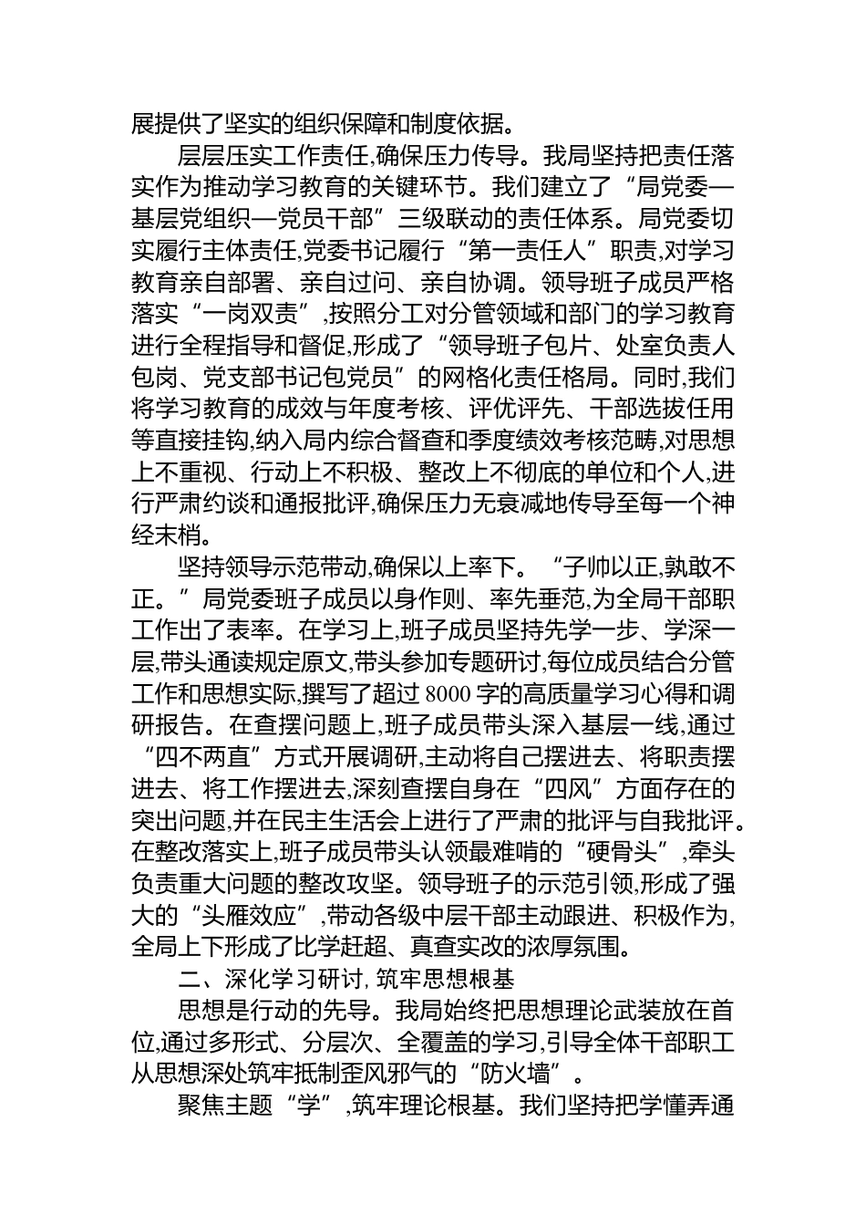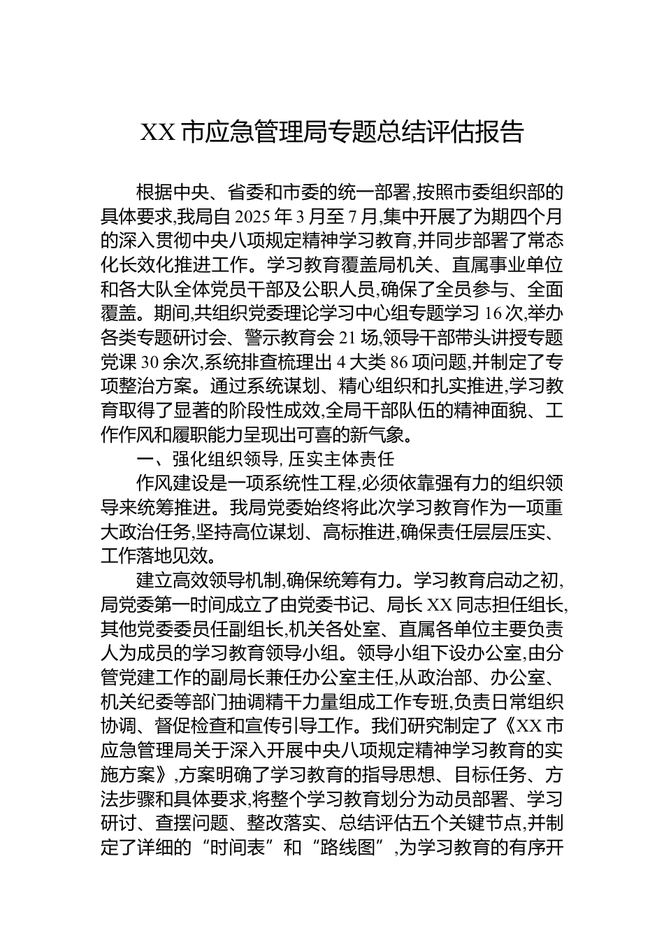 XX市應(yīng)急管理局專題總結(jié)評(píng)估報(bào)告根據(jù)中央、省委和市委的統(tǒng)一部署,按照市委組織部的具體要求,我局自2025年3月至7月,集中開展了為期四個(gè)月的深入貫徹中央八項(xiàng)規(guī)定精神學(xué)習(xí)教育,并同步部署了常態(tài)化長(zhǎng)效化推進(jìn)工作。學(xué)習(xí)教育覆蓋局機(jī)關(guān)、直屬事業(yè)單位和各大隊(duì)全體黨員干部及公職人員,確保了全員參與、全面覆蓋。期間,共組織黨委理論學(xué)習(xí)中心組專題學(xué)習(xí)16次,舉辦各類專題研討會(huì)、警示教育會(huì)21場(chǎng),領(lǐng)導(dǎo)干部帶頭講授專題黨課30余次,系統(tǒng)排查梳理出4大類86項(xiàng)問題,并制定了專項(xiàng)整治方案。通過系統(tǒng)謀劃、精心組織和扎實(shí)推進(jìn),學(xué)習(xí)教育取得了顯著的階段性成效,全局干部隊(duì)伍的精神面貌...