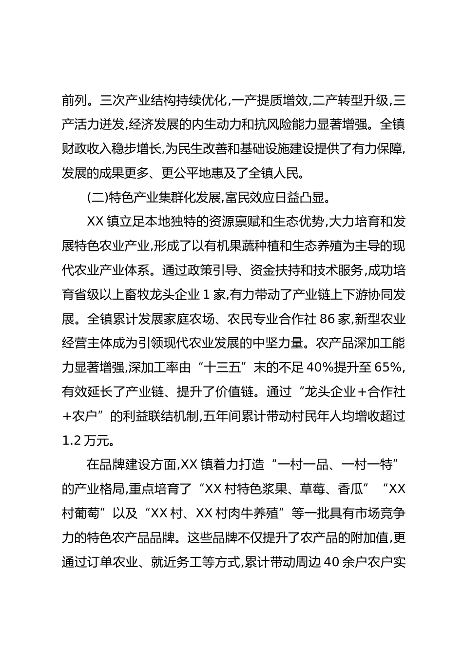 關(guān)于XX鎮(zhèn)“十四五”期間主要成就的調(diào)研報告“十四五”時期,是XX鎮(zhèn)全面推進(jìn)鄉(xiāng)村振興、加快農(nóng)業(yè)農(nóng)村現(xiàn)代化的關(guān)鍵五年。五年來,在鎮(zhèn)黨委、政府的堅強(qiáng)領(lǐng)導(dǎo)下,全鎮(zhèn)上下堅持以高質(zhì)量發(fā)展為統(tǒng)領(lǐng),緊扣農(nóng)業(yè)強(qiáng)、農(nóng)村美、農(nóng)民富的總體目標(biāo),銳意進(jìn)取、攻堅克難,推動經(jīng)濟(jì)社會發(fā)展取得了一系列矚目成就。鎮(zhèn)域經(jīng)濟(jì)實力顯著增強(qiáng),人民生活品質(zhì)穩(wěn)步提升,城鄉(xiāng)面貌發(fā)生深刻蝶變,社會治理效能持續(xù)彰顯,成功繪就了一幅產(chǎn)業(yè)興旺、生態(tài)宜居、鄉(xiāng)風(fēng)文明、治理有效、生活富裕的鄉(xiāng)村振興新畫卷。本報告旨在系統(tǒng)梳理和總結(jié)XX鎮(zhèn)在“十四五”期間的主要工作亮點與成就。一、經(jīng)濟(jì)發(fā)展邁上新臺階,產(chǎn)業(yè)振興...