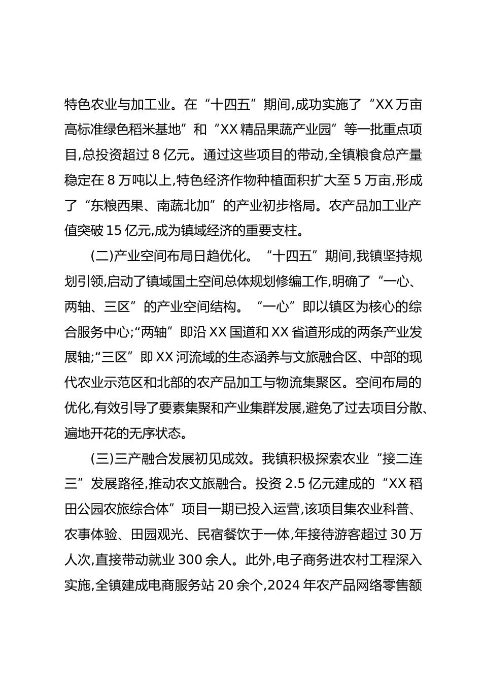 關(guān)于XX鎮(zhèn)“十五五”發(fā)展面臨問題與規(guī)劃初步設(shè)想的報告為系統(tǒng)謀劃我鎮(zhèn)2026年至2030年發(fā)展藍(lán)圖,科學(xué)應(yīng)對新發(fā)展階段的機(jī)遇與挑戰(zhàn),全面推進(jìn)鄉(xiāng)村振興戰(zhàn)略,鎮(zhèn)黨委、政府組織專門力量,在深入調(diào)研和廣泛征求意見的基礎(chǔ)上,回顧總結(jié)“十四五”時期發(fā)展成效,深刻剖析當(dāng)前面臨的主要問題,并就“十五五”時期發(fā)展目標(biāo)、重點任務(wù)和重大項目形成初步設(shè)想?,F(xiàn)將有關(guān)情況報告如下。一、“十四五”發(fā)展回顧與成效“十四五”時期,面對復(fù)雜嚴(yán)峻的宏觀環(huán)境和艱巨繁重的發(fā)展任務(wù),我鎮(zhèn)堅持以高質(zhì)量發(fā)展為主題,緊抓鄉(xiāng)村振興戰(zhàn)略機(jī)遇,經(jīng)濟(jì)社會發(fā)展取得顯著成就,為開啟“十五五”新征程奠定了堅實基...