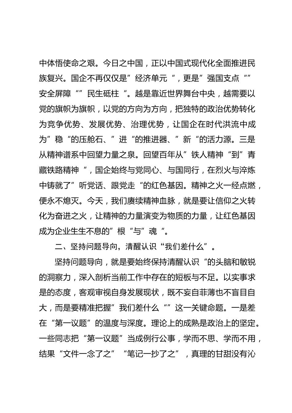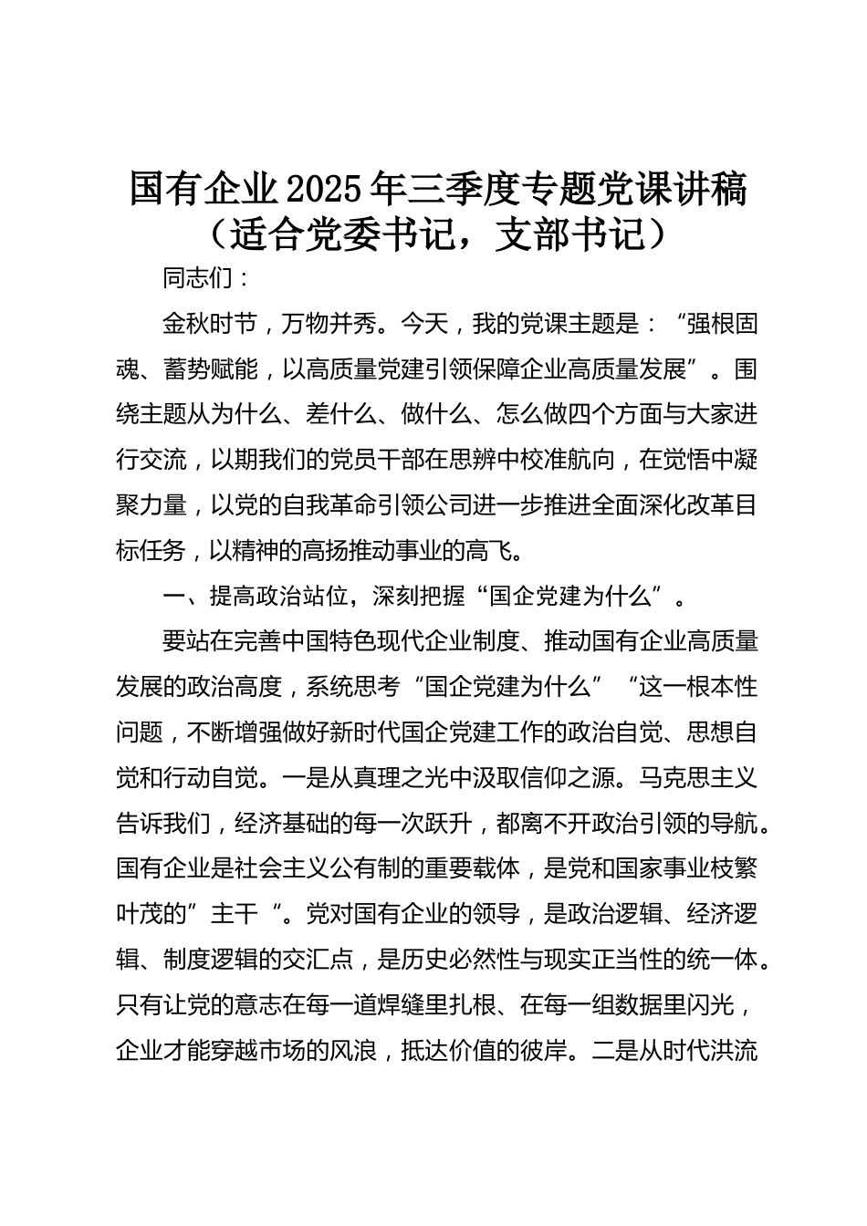 國有企業(yè)2025年三季度專題黨課講稿(適合黨委書記,支部書記)同志們:金秋時(shí)節(jié),萬物并秀。今天,我的黨課主題是:“強(qiáng)根固魂、蓄勢賦能,以高質(zhì)量黨建引領(lǐng)保障企業(yè)高質(zhì)量發(fā)展”。圍繞主題從為什么、差什么、做什么、怎么做四個(gè)方面與大家進(jìn)行交流,以期我們的黨員干部在思辨中校準(zhǔn)航向,在覺悟中凝聚力量,以黨的自我革命引領(lǐng)公司進(jìn)一步推進(jìn)全面深化改革目標(biāo)任務(wù),以精神的高揚(yáng)推動(dòng)事業(yè)的高飛。一、提高政治站位,深刻把握“國企黨建為什么”。要站在完善中國特色現(xiàn)代企業(yè)制度、推動(dòng)國有企業(yè)高質(zhì)量發(fā)展的政治高度,系統(tǒng)思考“國企黨建為什么”“這一根本性問題,不斷增...