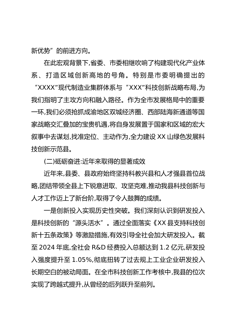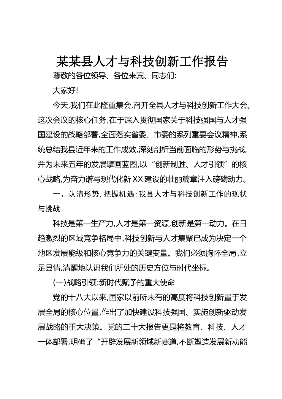 某某縣人才與科技創(chuàng)新工作報告尊敬的各位領(lǐng)導(dǎo)、各位來賓、同志們:大家好!今天,我們在此隆重集會,召開全縣人才與科技創(chuàng)新工作大會。這次會議的核心任務(wù),在于深入貫徹國家關(guān)于科技強國與人才強國建設(shè)的戰(zhàn)略部署,全面落實省委、市委的系列重要會議精神,系統(tǒng)總結(jié)我縣近年來的工作成效,深刻剖析當前面臨的形勢與挑戰(zhàn),并為未來五年的發(fā)展擘畫藍圖,以“創(chuàng)新制勝、人才引領(lǐng)”的核心戰(zhàn)略,為奮力譜寫現(xiàn)代化新XX建設(shè)的壯麗篇章注入磅礴動力。一、認清形勢,把握機遇:我縣人才與科技創(chuàng)新工作的現(xiàn)狀與挑戰(zhàn)科技是第一生產(chǎn)力,人才是第一資源,創(chuàng)新是第一動力。在日趨激烈的區(qū)域競爭格局中,...