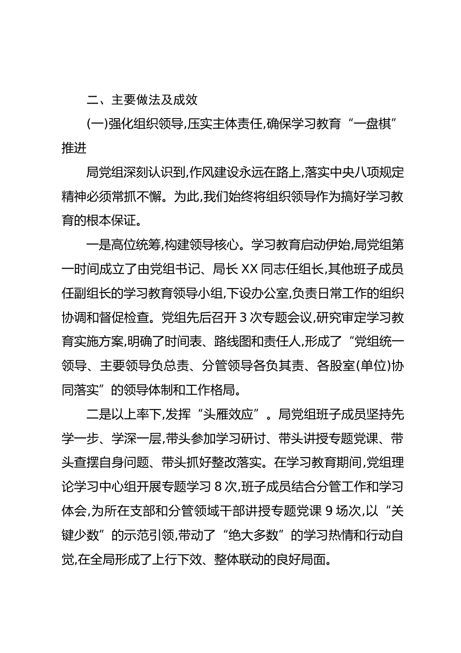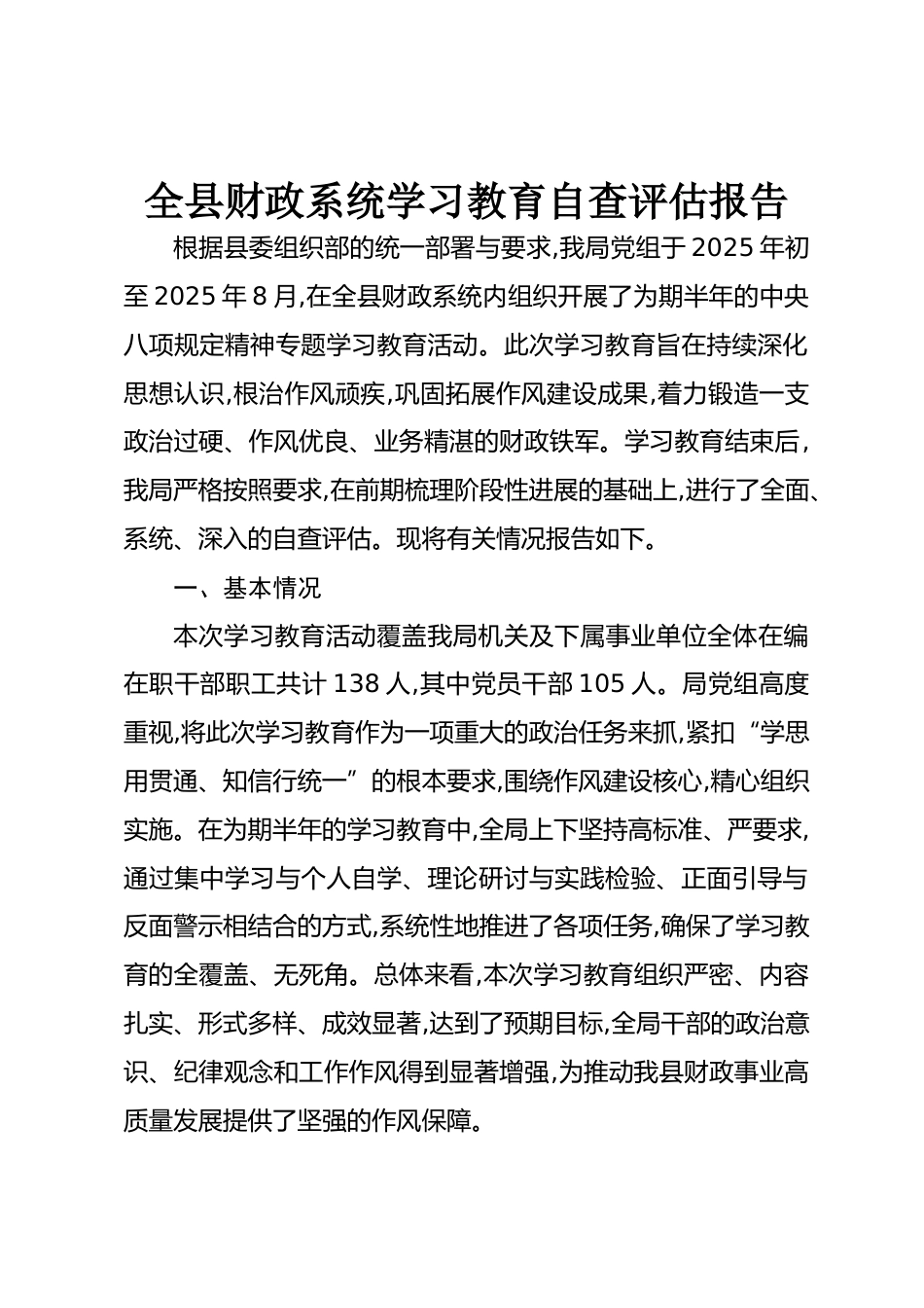 全縣財政系統(tǒng)學(xué)習(xí)教育自查評估報告根據(jù)縣委組織部的統(tǒng)一部署與要求,我局黨組于2025年初至2025年8月,在全縣財政系統(tǒng)內(nèi)組織開展了為期半年的中央八項規(guī)定精神專題學(xué)習(xí)教育活動。此次學(xué)習(xí)教育旨在持續(xù)深化思想認識,根治作風(fēng)頑疾,鞏固拓展作風(fēng)建設(shè)成果,著力鍛造一支政治過硬、作風(fēng)優(yōu)良、業(yè)務(wù)精湛的財政鐵軍。學(xué)習(xí)教育結(jié)束后,我局嚴格按照要求,在前期梳理階段性進展的基礎(chǔ)上,進行了全面、系統(tǒng)、深入的自查評估?,F(xiàn)將有關(guān)情況報告如下。一、基本情況本次學(xué)習(xí)教育活動覆蓋我局機關(guān)及下屬事業(yè)單位全體在編在職干部職工共計138人,其中黨員干部105人。局黨組高度重視,將此次學(xué)習(xí)教...