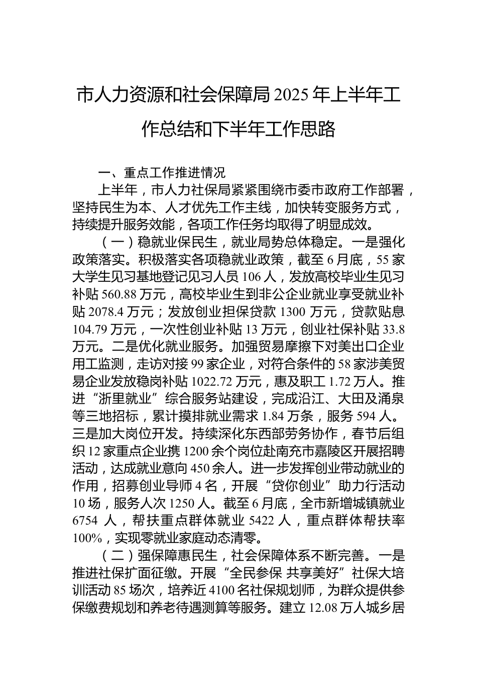 市人力資源和社會(huì)保障局2025年上半年工作總結(jié)和下半年工作思路一、重點(diǎn)工作推進(jìn)情況上半年,市人力社保局緊緊圍繞市委市政府工作部署,堅(jiān)持民生為本、人才優(yōu)先工作主線,加快轉(zhuǎn)變服務(wù)方式,持續(xù)提升服務(wù)效能,各項(xiàng)工作任務(wù)均取得了明顯成效。(一)穩(wěn)就業(yè)保民生,就業(yè)局勢總體穩(wěn)定。一是強(qiáng)化政策落實(shí)。積極落實(shí)各項(xiàng)穩(wěn)就業(yè)政策,截至6月底,55家大學(xué)生見習(xí)基地登記見習(xí)人員106人,發(fā)放高校畢業(yè)生見習(xí)補(bǔ)貼560.88萬元,高校畢業(yè)生到非公企業(yè)就業(yè)享受就業(yè)補(bǔ)貼2078.4萬元;發(fā)放創(chuàng)業(yè)擔(dān)保貸款1300萬元,貸款貼息104.79萬元,一次性創(chuàng)業(yè)補(bǔ)貼13萬元,創(chuàng)業(yè)社保補(bǔ)貼33.8萬元。二是優(yōu)...