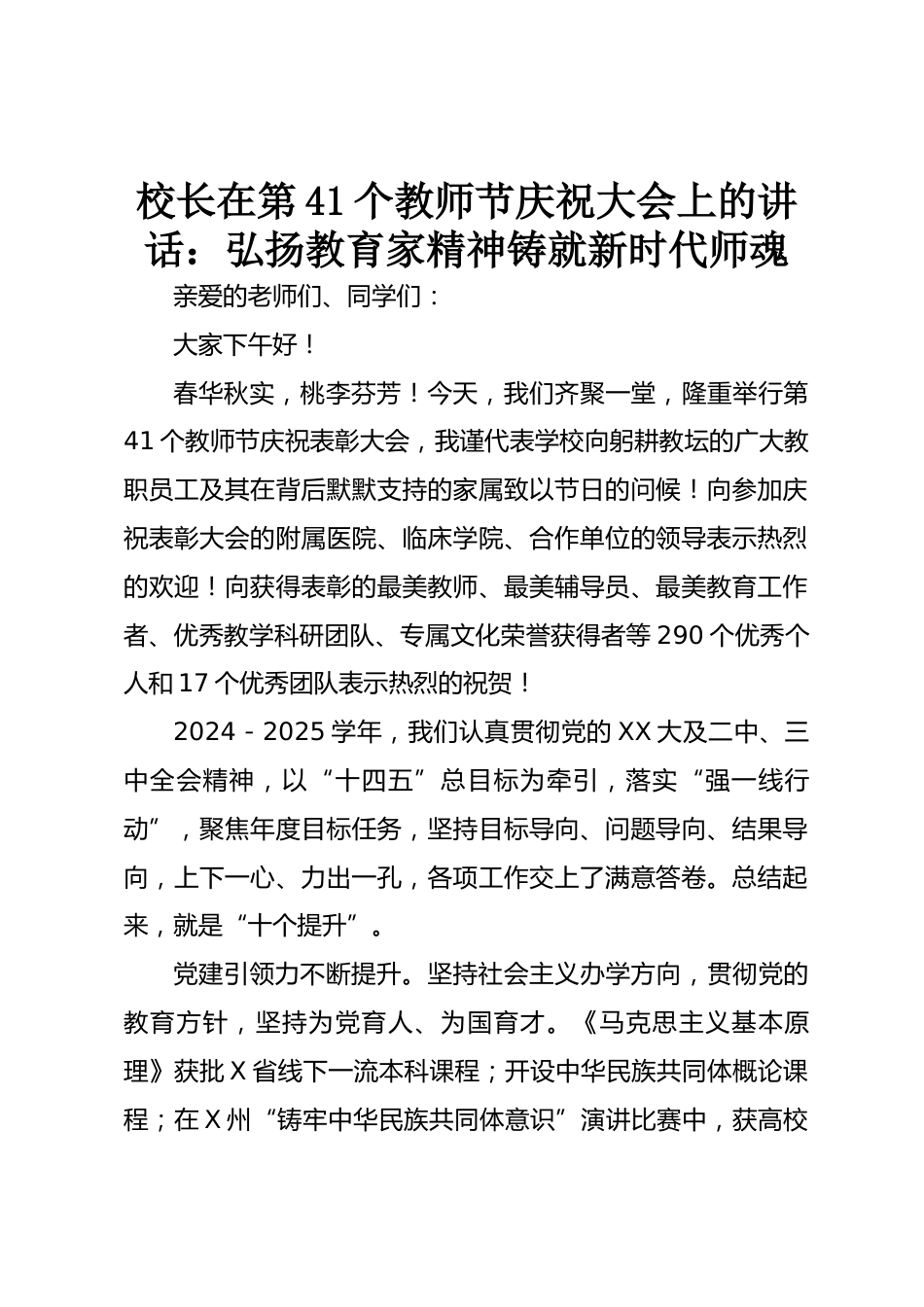校長(zhǎng)在第41個(gè)教師節(jié)慶祝大會(huì)上的講話:弘揚(yáng)教育家精神鑄就新時(shí)代師魂