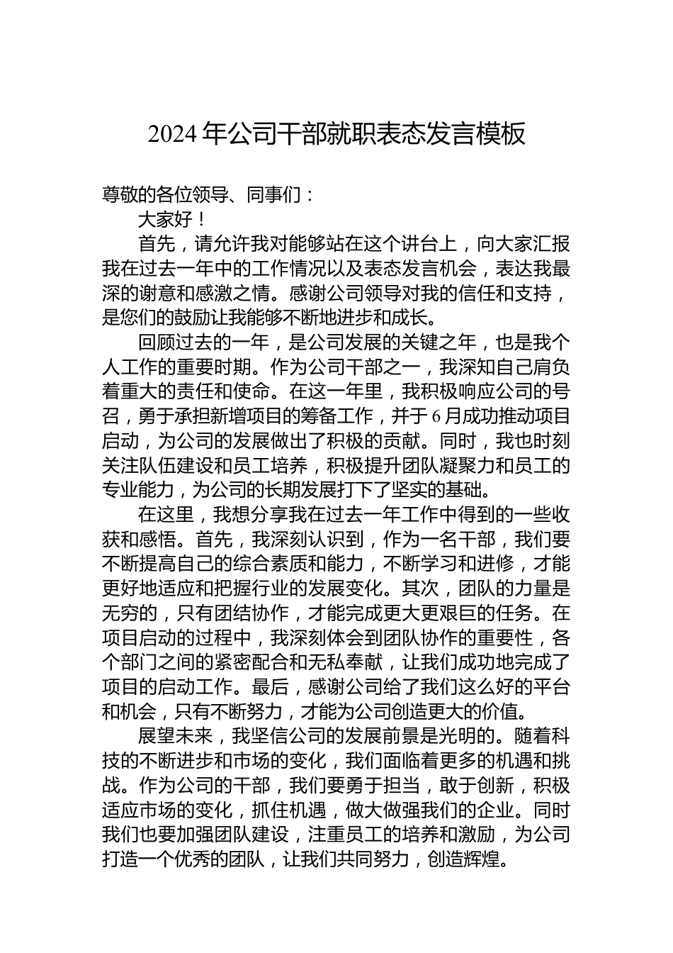 2024年公司干部就職表態(tài)發(fā)言模板尊敬的各位領(lǐng)導(dǎo)、同事們:大家好!首先,請允許我對能夠站在這個講臺上,向大家匯報我在過去一年中的工作情況以及表態(tài)發(fā)言機會,表達我最深的謝意和感激之情。感謝公司領(lǐng)導(dǎo)對我的信任和支持,是您們的鼓勵讓我能夠不斷地進步和成長。回顧過去的一年,是公司發(fā)展的關(guān)鍵之年,也是我個人工作的重要時期。作為公司干部之一,我深知自己肩負著重大的責(zé)任和使命。在這一年里,我積極響應(yīng)公司的號召,勇于承擔新增項目的籌備工作,并于6月成功推動項目啟動,為公司的發(fā)展做出了積極的貢獻。同時,我也時刻關(guān)注隊伍建設(shè)和員工培養(yǎng),積極提升團隊...