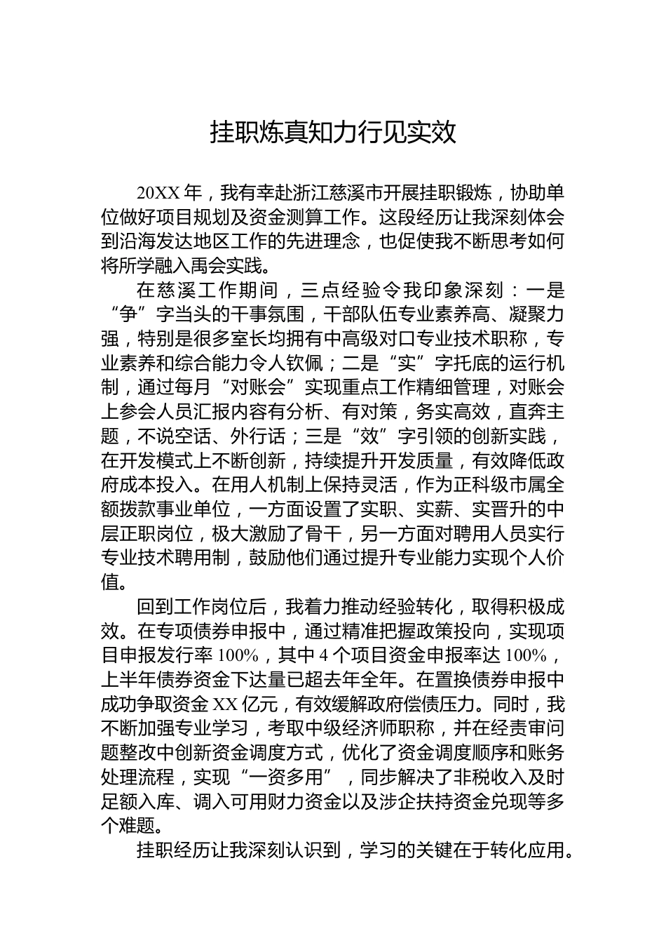 XX區(qū)掛職干部座談會交流發(fā)言材料匯編(5篇)目錄1.掛職煉真知力行見實效22.掛職取經(jīng)強實踐改革賦能促發(fā)展..........................43.汲取經(jīng)驗強本領(lǐng),實干擔(dān)當(dāng)啟新程.......................64.經(jīng)驗啟示明方向,砥礪奮進謀新篇.......................85.學(xué)習(xí)XX區(qū)城管經(jīng)驗助推基層治理提質(zhì)增效.........10掛職煉真知力行見實效20XX年,我有幸赴浙江慈溪市開展掛職鍛煉,協(xié)助單位做好項目規(guī)劃及資金測算工作。這段經(jīng)歷讓我深刻體會到沿海發(fā)達(dá)地區(qū)工作的先進理念,也促使我不斷思考如何將所學(xué)融入禹會實踐。在慈溪工作期間,三點經(jīng)驗令我印象深刻:一是“爭”字當(dāng)頭的干...